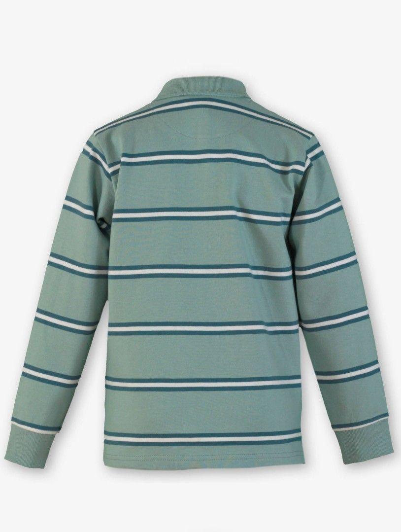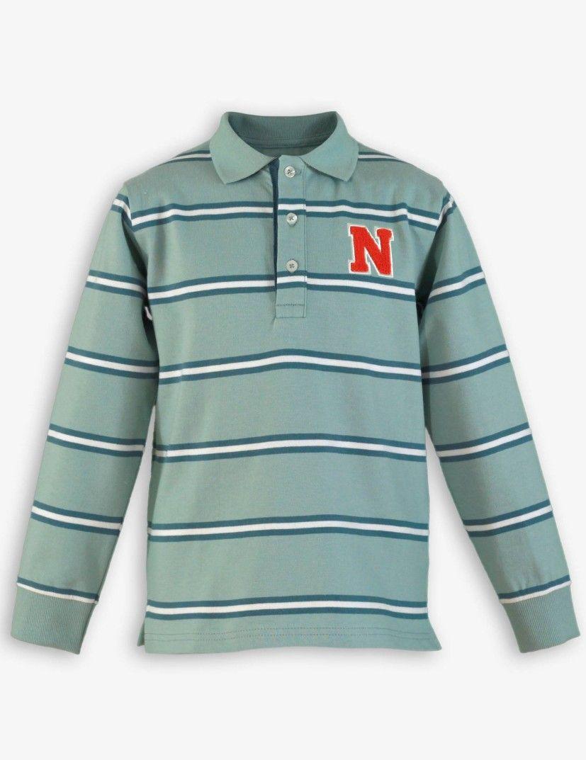 Elegante polo de manga larga para niño de la marca Miranda. Confeccionado en color verde con rayas blanco y marino. Luce botonadura de 3 botones vistos en el delantero y letra "N" en rojo.