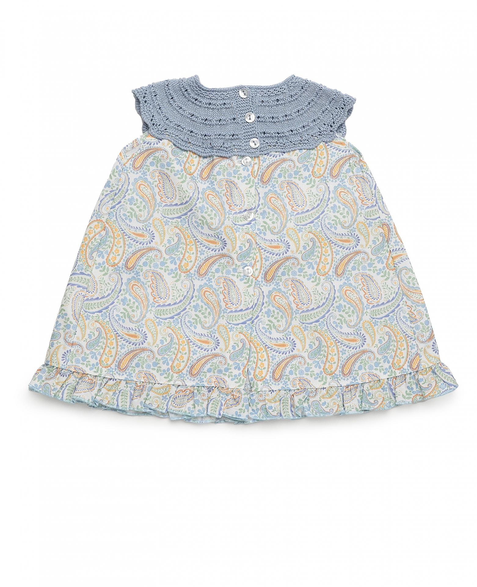 Elegante vestido para niña sin mangas de la marca Juliana. Confeccionado con el cuerpo de punto redondo de color azul y falda de tela blanca estampada de cachemiras al tono. Luce volante en el bajo. Cierra en la espalda.
