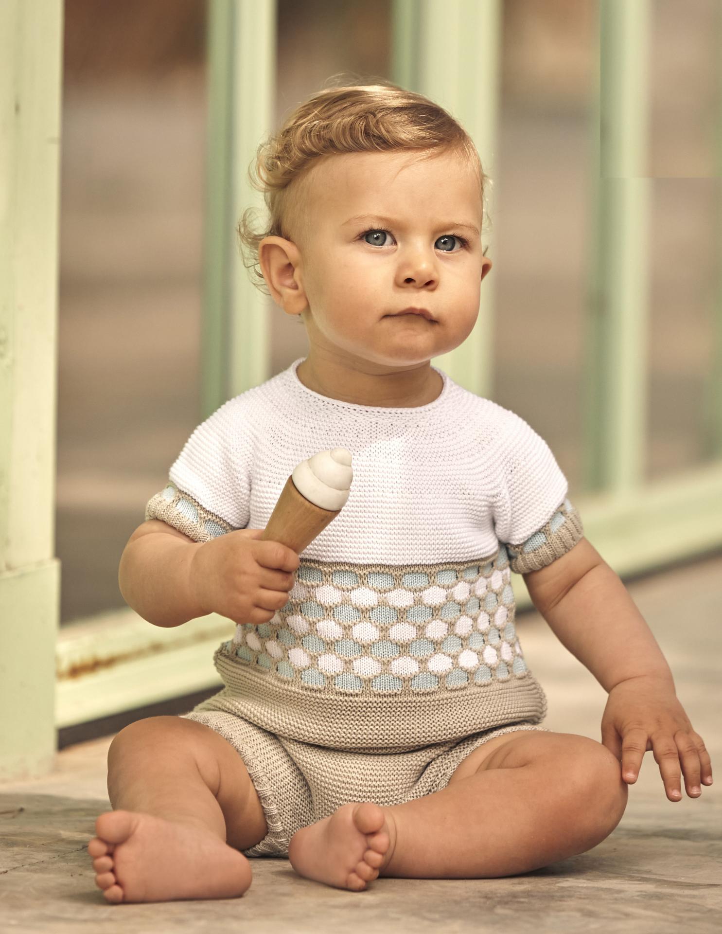 Conjunto de dos piezas para bebé niño de la marca Juliana, ideal para la temporada primavera-verano por su diseño fresco, ligero y cómodo. Está confeccionado en punto de verano, suave al tacto y perfecto para acompañar los movimientos del bebé.