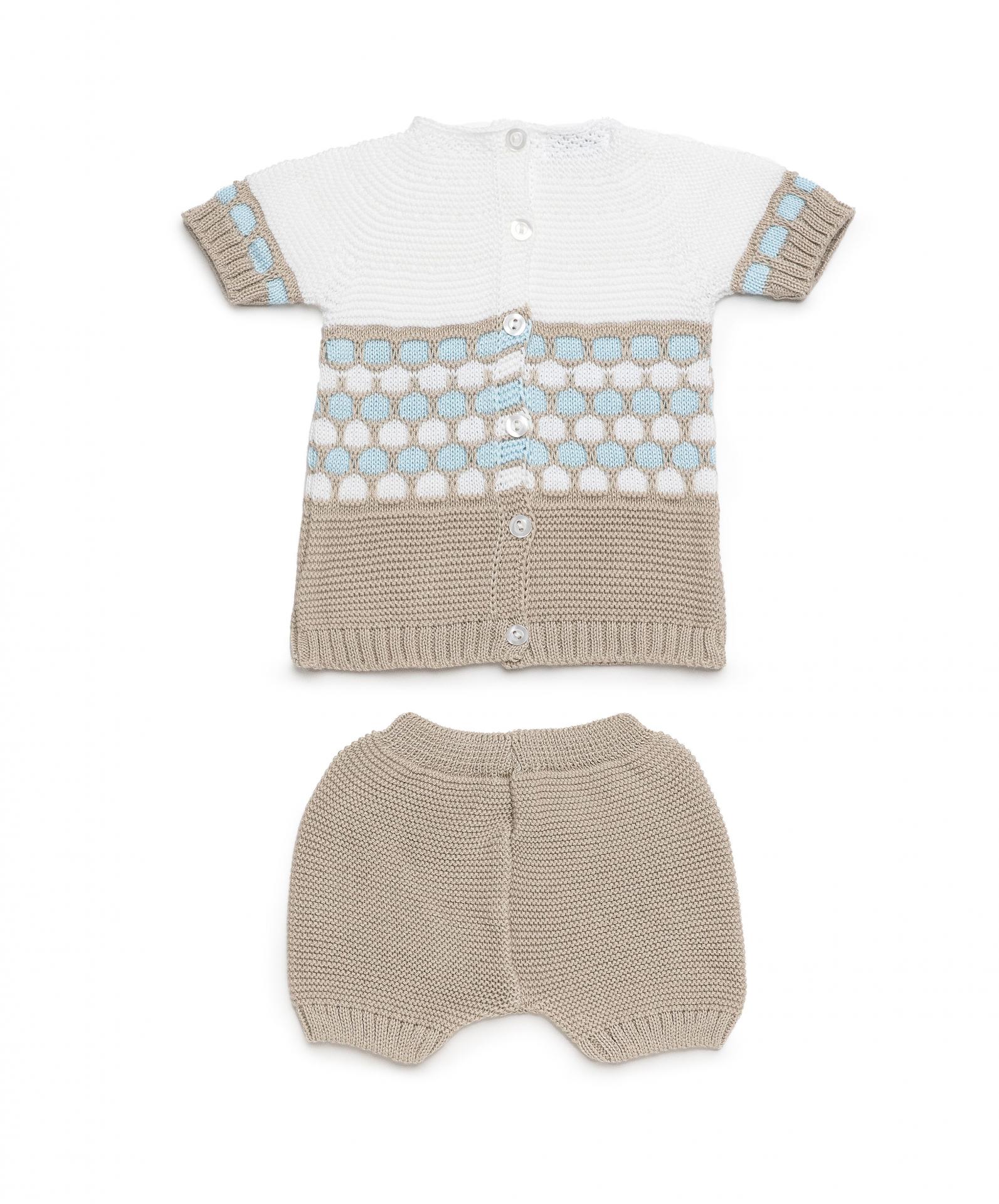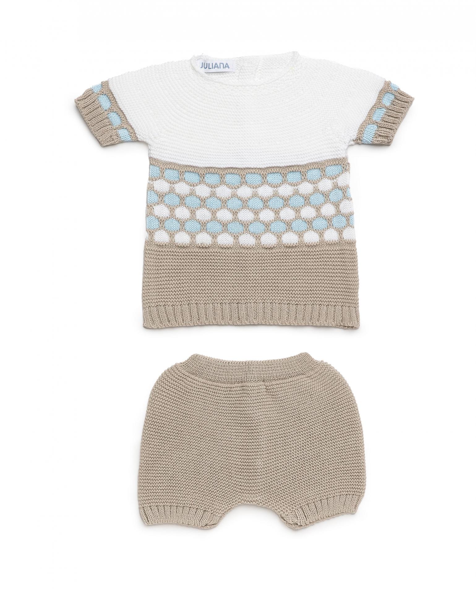 Conjunto de 2 piezas para bebé niño de la marca Juliana. Confeccionado en punto de verano, se compone de jersey de punto de manga corta tipo ranglán de color blanco y beige con cenefa en el cuerpo y las mangas, a juego con pantalón corto de color beige, que lleva elástico en la cintura y las perneras.