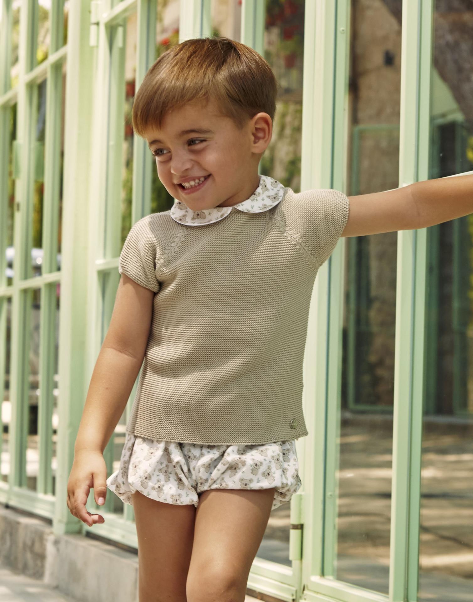 Está compuesto por un dulce jersey de punto en color beige, con manga corta tipo ranglán y cuello blanco de solapas decorado con un tierno estampado de koalas, que añade un toque divertido y delicado al diseño.