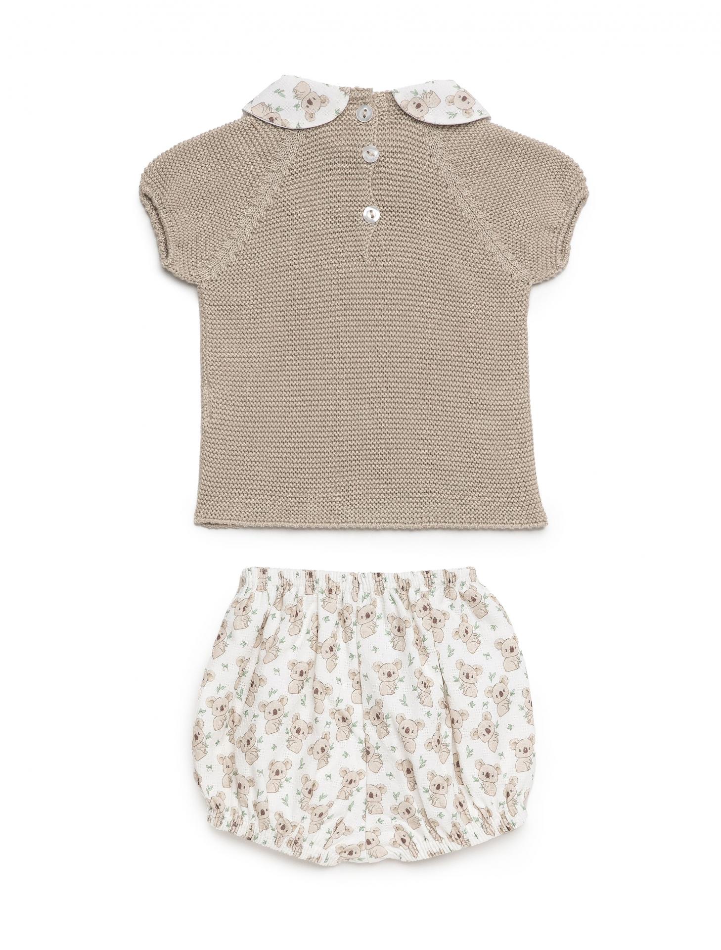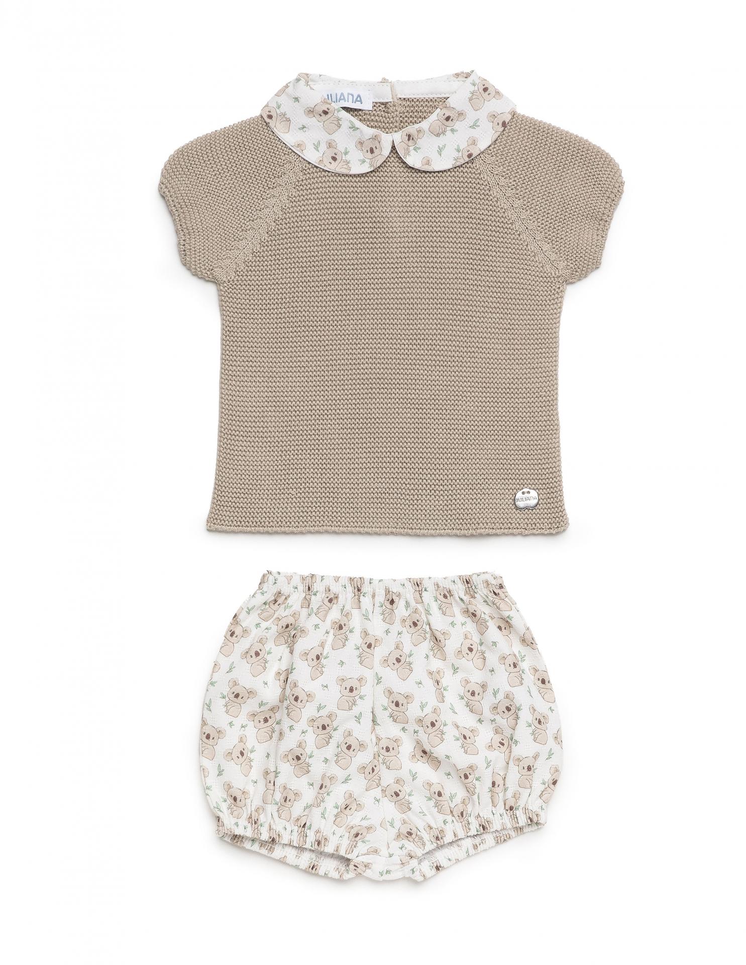 Conjunto de 2 piezas para bebé niño de la marca Juliana. Se compone de jersey de punto color beige de manga corta tipo ranglán con cuello blanco de solapas estampado de koalas, a juego con pantalón corto de color blanco estampado de koalas igual que el cuello, que lleva elástico en la cintura y las perneras.