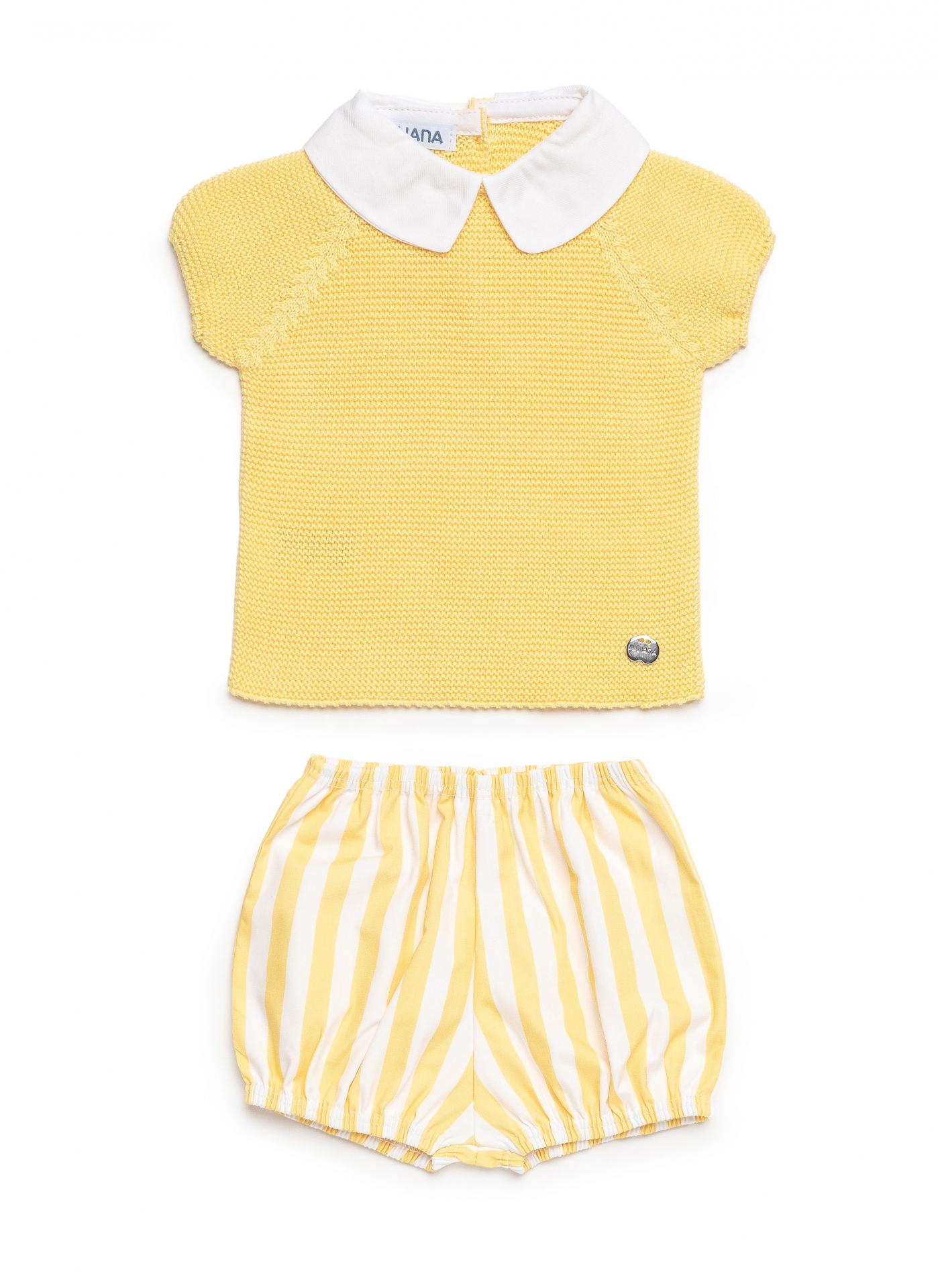 Conjunto de 2 piezas para bebé niño de la marca Juliana. Se compone de jersey de punto coloramarillo de manga corta tipo ranglán con cuello blanco de solapas a rayas amarillas, a juego con pantalón corto de color blanco estampado de rayas amarillas igual que el cuello, que lleva elástico en la cintura y las perneras.