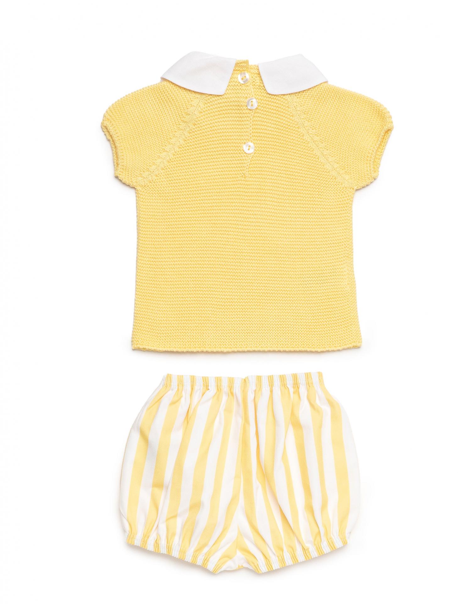 Incluye un jersey de punto en color amarillo con manga corta tipo ranglán y cuello blanco de solapas decorado con finas rayas amarillas, aportando un toque clásico y encantador.