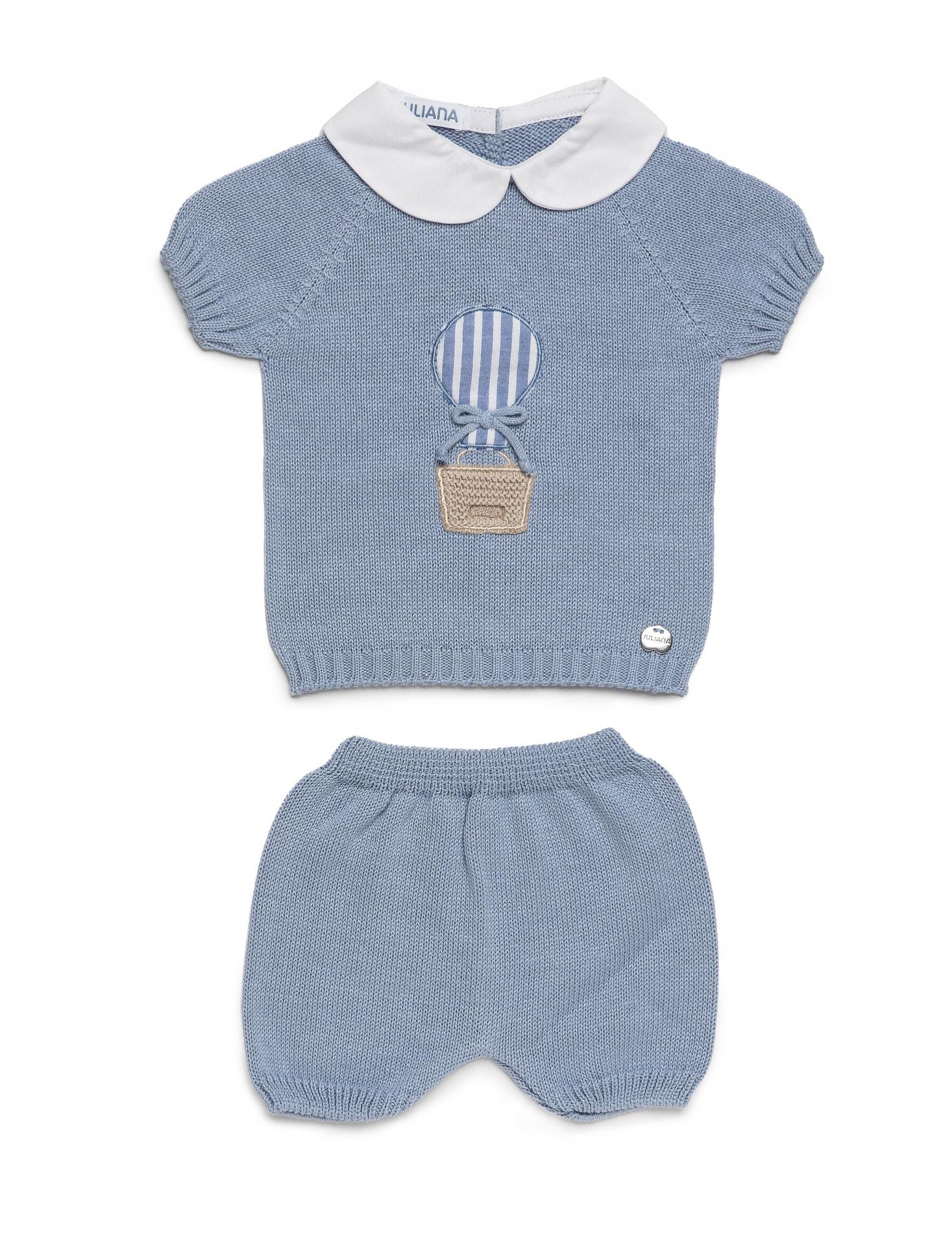 Conjunto de 2 piezas para bebé niño de la marca Juliana. Confeccionado en punto de verano, se compone de jersey de punto de manga corta tipo ranglán de color azul con cuello de solapas blanco y imagen de globo en el delantero, a juego con pantalón corto del mismo color, que lleva elástico en la cintura y las perneras. El jersey cierra en la espalda con botonadura vista.