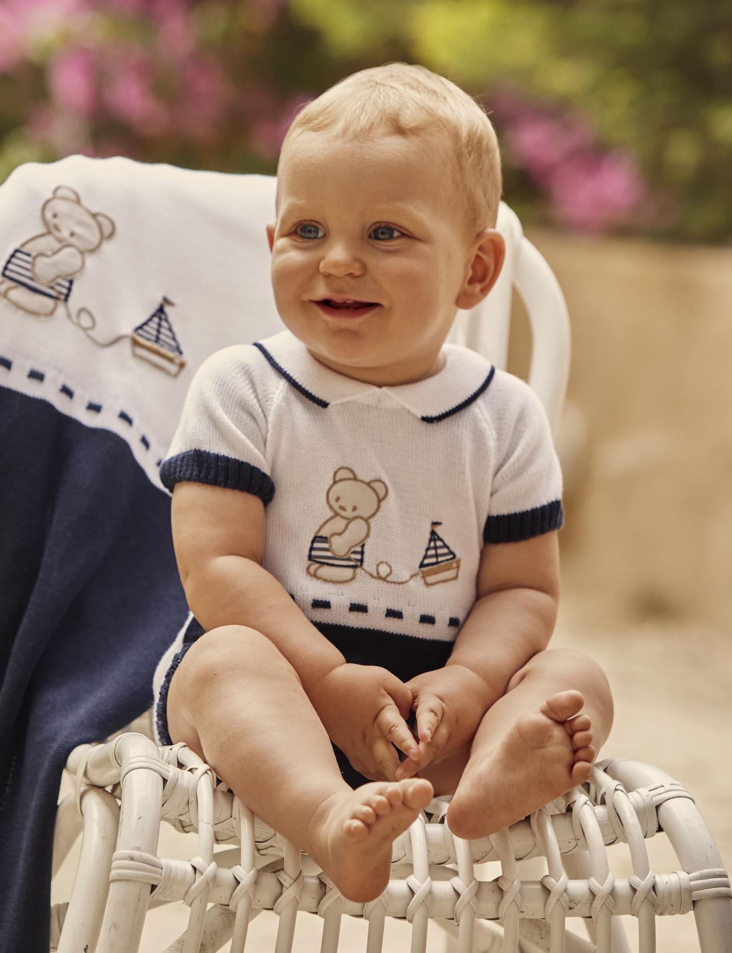 Incluye un jersey de manga corta tipo ranglán en color blanco con detalles en tono marino, con cuello de solapas blanco y una tierna imagen de osito y barco en el delantero que aporta un aire dulce y divertido. El jersey cierra en la espalda con botonadura vista para facilitar el vestido del bebé.
