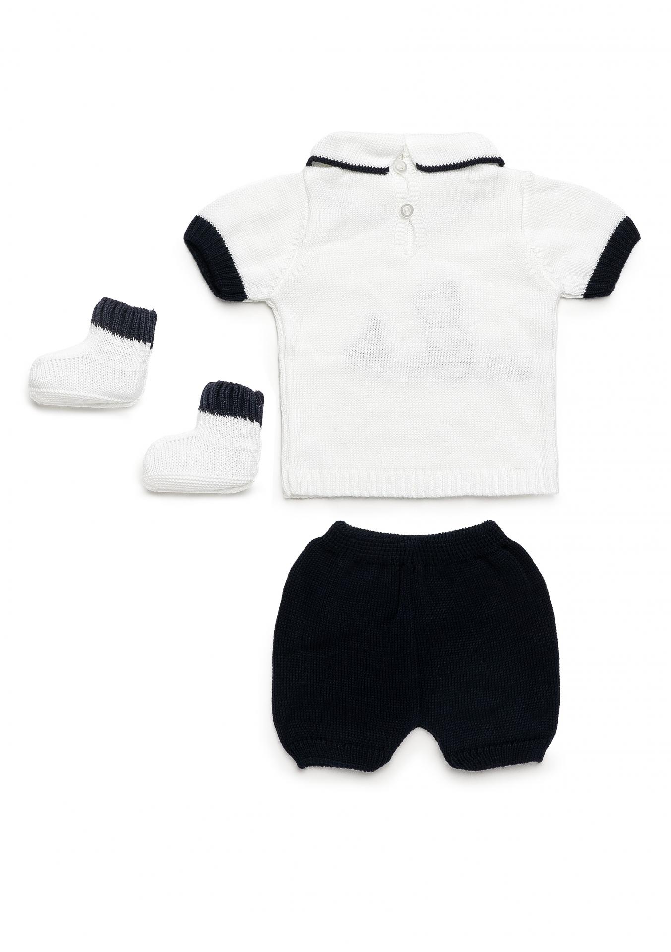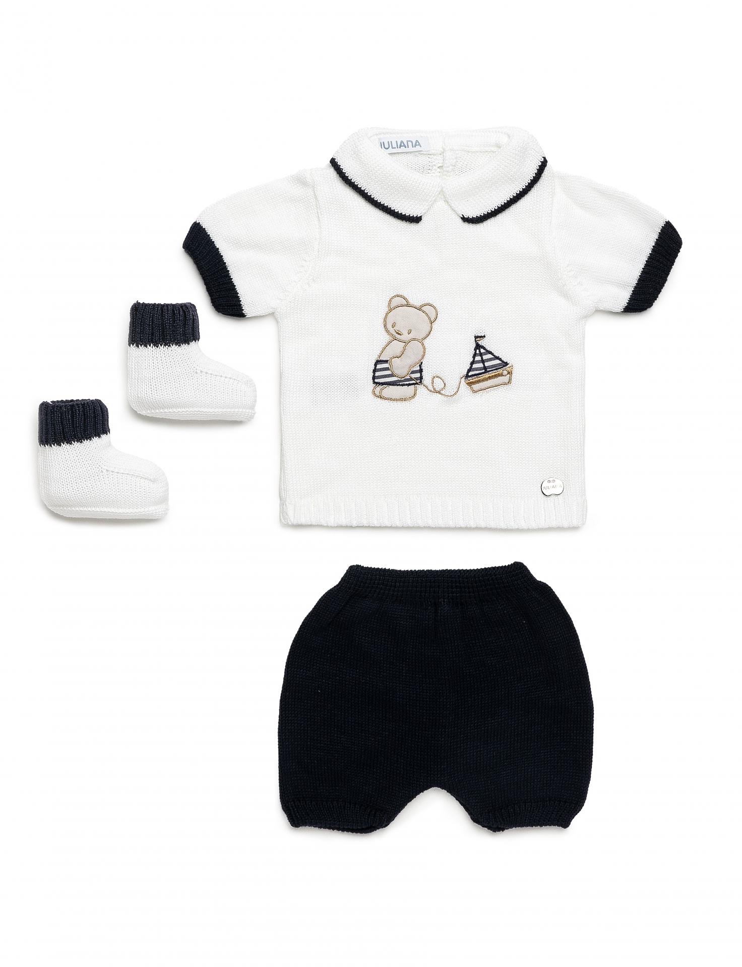 Conjunto de 2 piezas para bebé niño de la marca Juliana. Confeccionado en punto de verano, se compone de jersey de punto de manga corta tipo ranglán de color blanco con detalles marino, con cuello de solapas blanco y imagen de osito y barco en el delantero, a juego con pantalón corto marino, que lleva elástico en la cintura y las perneras y patucos tambien a juego. El jersey cierra en la espalda con botonadura vista.