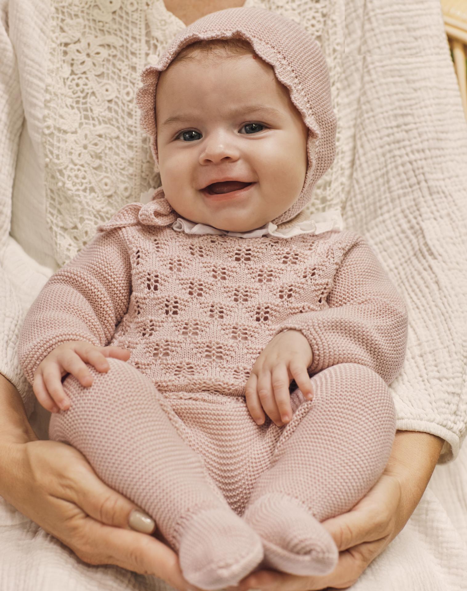 Incluye un jersey de manga larga tipo ranglán en color rosa palo, con delicado diseño de punto calado que añade un toque dulce y elegante. El cierre se realiza mediante botonadura vista en la espalda, facilitando el vestido del bebé.