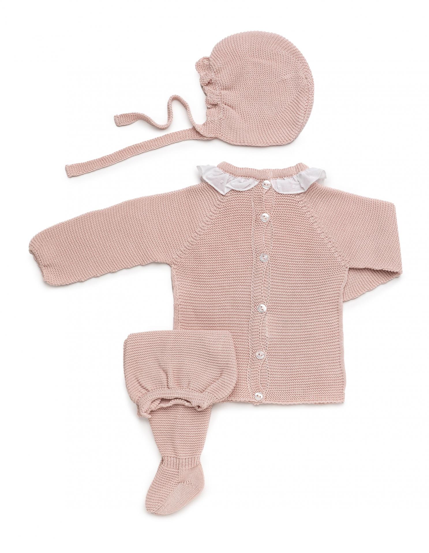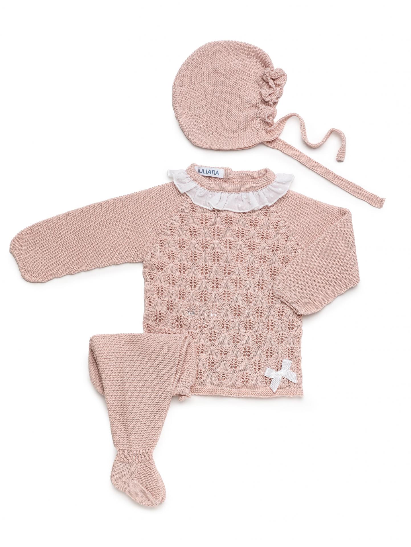 Conjunto de 3 piezas para bebé niña de la marca Juliana. Se compone de jersey color rosa palo de manga larga tipo ranglán con diseño de punto calado. Cierra con botonadura vista en la espalda y va a juego con polaina de color rosa palo y gorrito.