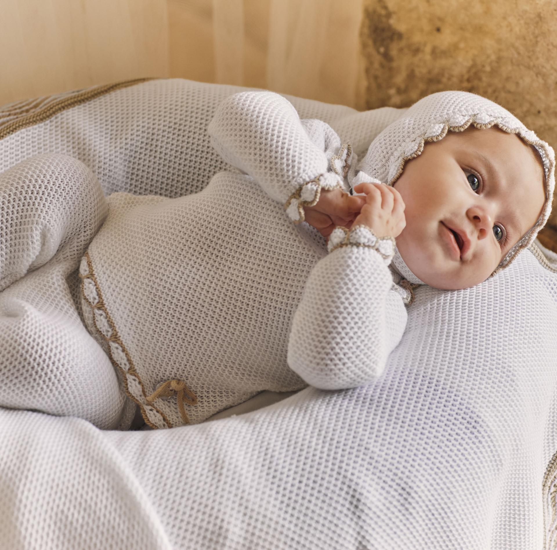 Incluye un jersey de manga larga tipo ranglán en color blanco, con delicado diseño de punto de recogidas. Presenta ondas combinadas en beige en el bajo y los puños, aportando un sutil contraste y un toque elegante. El cierre se realiza mediante botonadura vista en la espalda, facilitando el vestido del bebé.