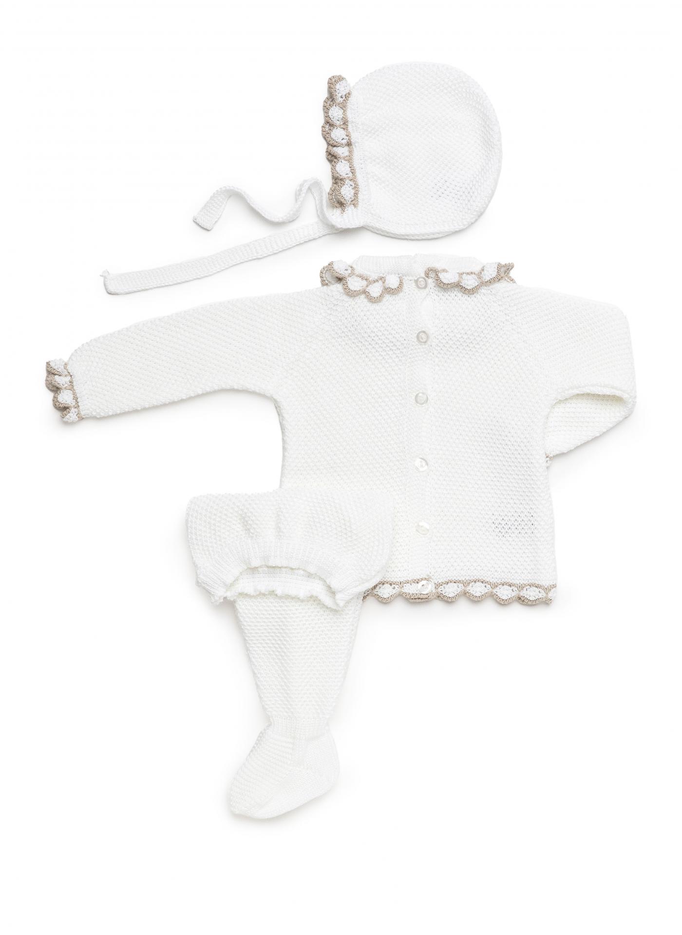 Conjunto de 3 piezas para bebé niña de la marca Juliana. Se compone de jersey color blanco de manga larga tipo ranglán con diseño de punto de recogidas y luce ondas combinadas en beige en el bajo y los puños. Cierra con botonadura vista en la espalda y va a juego con polaina de color blanco y gorrito.