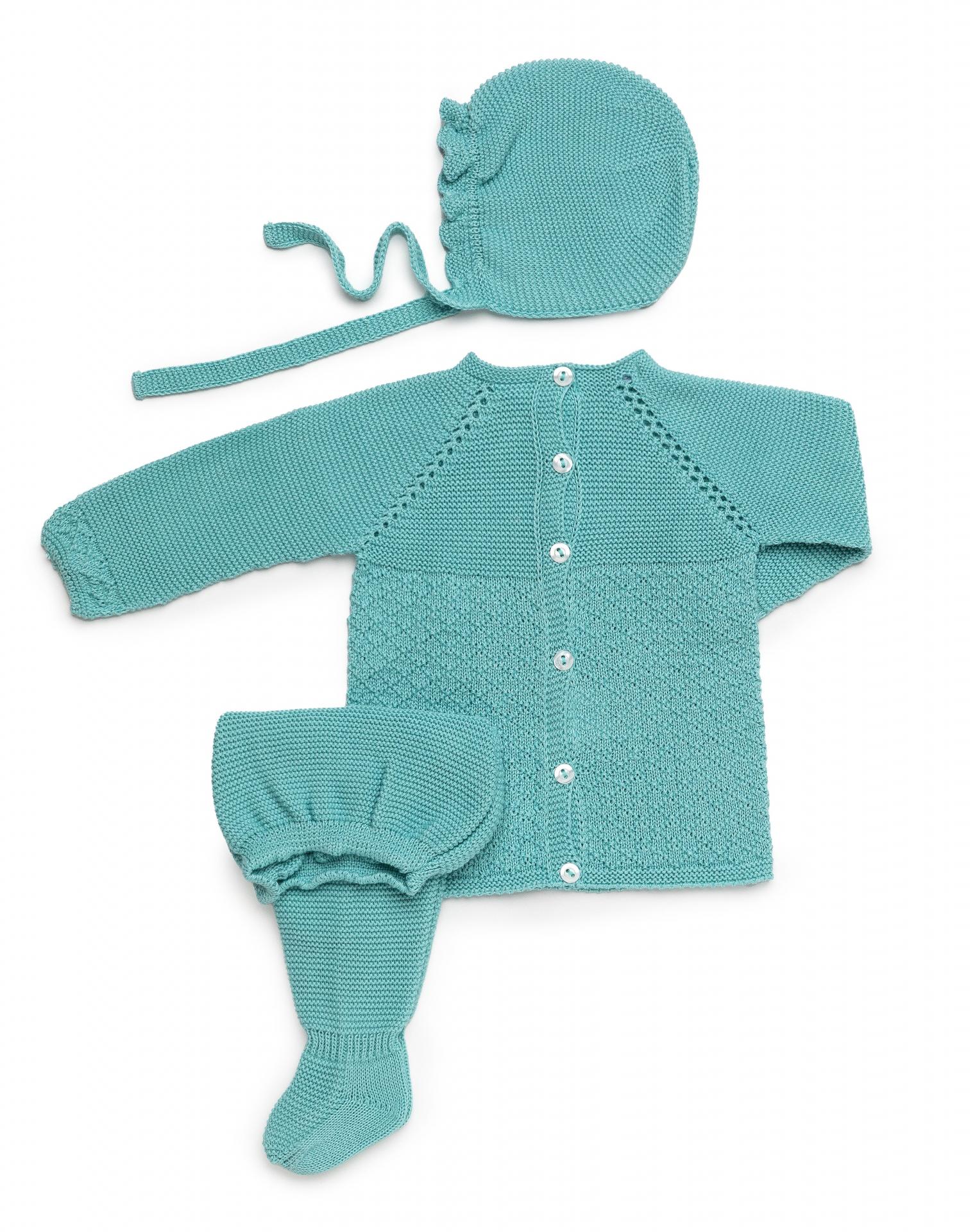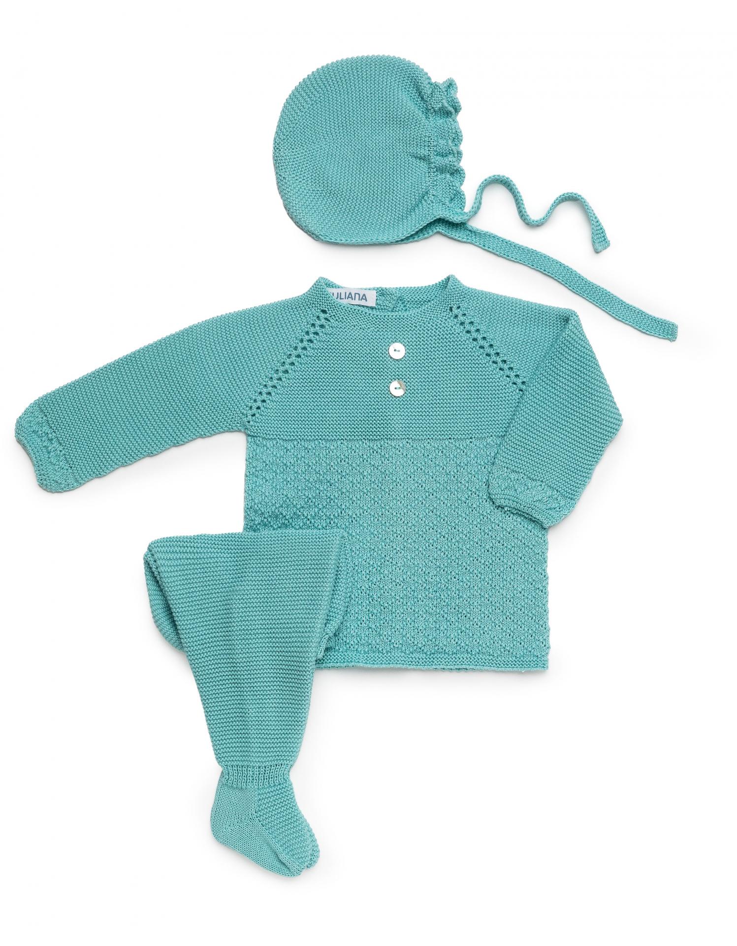 Conjunto de 3 piezas para bebé niño de la marca Juliana. Se compone de jersey color verde lago de manga larga tipo ranglán con diseño de punto de rombos que luce botones en el delantero. Cierra con botonadura vista en la espalda y va a juego con polaina de color verde lago y gorrito.