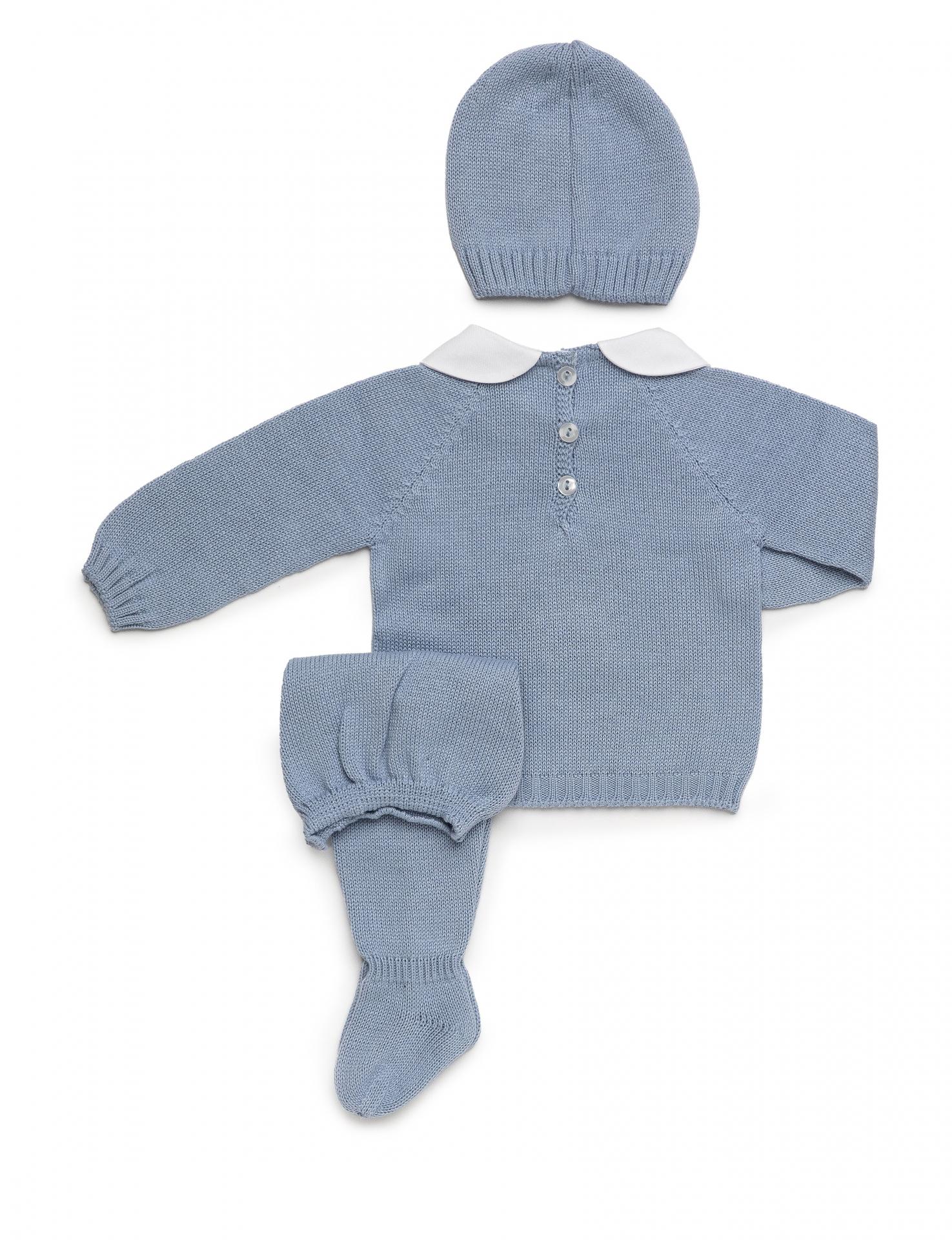Conjunto de 3 piezas para bebé niño de la marca Juliana. Se compone de jersey color azul de manga larga tipo ranglán con diseño de globo en el delantero y cuello de solapas de tela blanco. Cierra con botonadura vista en la espalda y va a juego con polaina de color azul y gorrito.