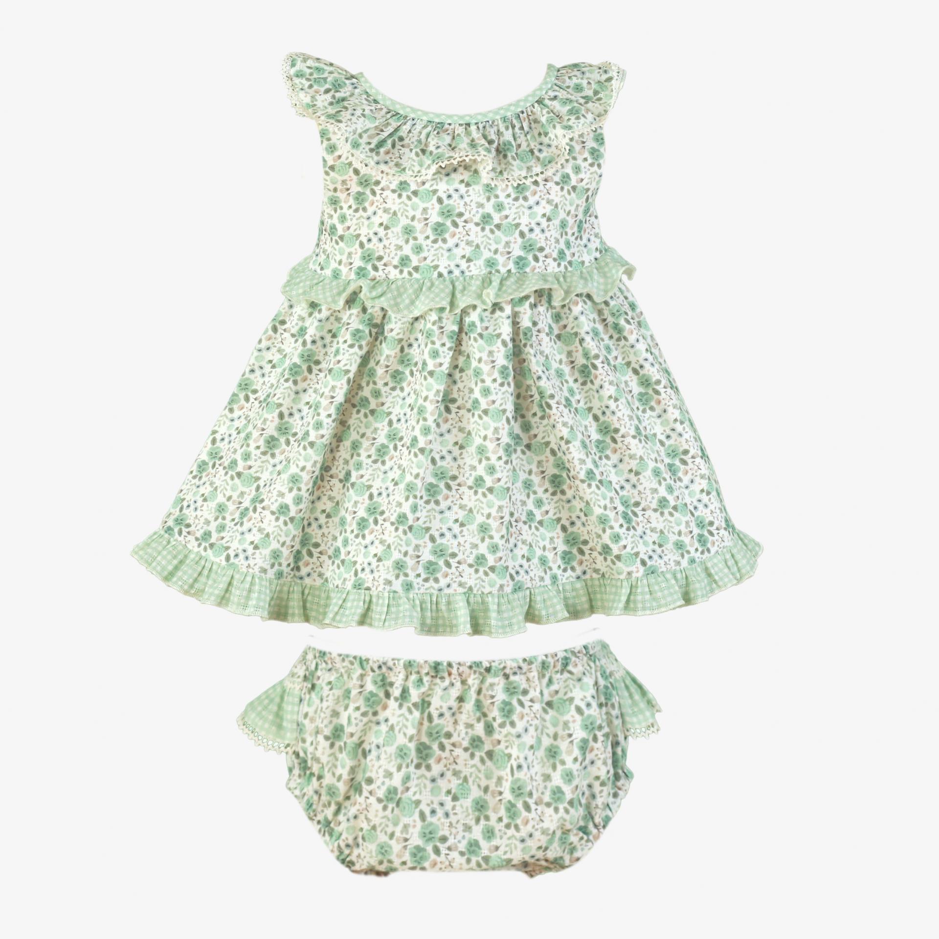 Sobresaliente vestido sin mangas para bebe niña de la marca Miranda. Es de color blanco con estampado de flores en tono verde. Tiene corte alto muy drapeado con pequeño volante de cuadro vichy en el corte y el bajo. Luce escote redondo y lleva volante de la misma tela en el cuello. Cierra en la espalda y lleva braguita de cuadro vichy verde a juego.