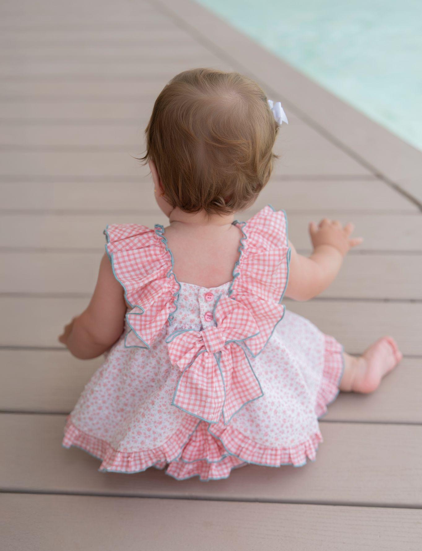 Incluye braguita de cuadro vichy rosa con volantes en la parte trasera, combinada a la perfección con el vestido para lograr un conjunto armonioso y adorable.