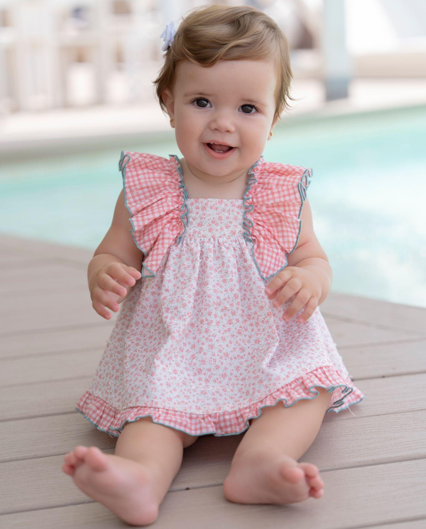 Elegante vestido sin mangas para bebe niña de la marca Miranda. Es de color blanco con estampado de flores en tono rosa palo. Es de corte evasé con pequeño volante de cuadro vichy rosa y blanco en el bajo. Luce escote cuadrado y lleva volantes de la misma tela en los hombros. Cierra en la espalda con botonadura vista, donde ademas luce gran lazada de cuadro vichy. Lleva braguita de cuadro vichy rosa con volantes en la parte trasera a juego con el vestido.