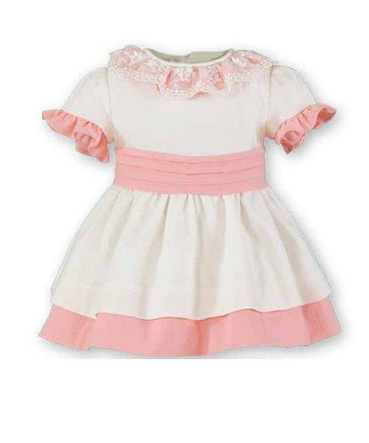 Coqueto vestido de manga corta para bebe niña de la marca Miranda. Es de color blanco y lleva corte en la cintura, donde ademas esta drapeado y luce simil de fajin en color rosa palo. Tambien luce volante rosa palo en el bajo de la prenda y las mangas, asi como en el cuello, donde lleva un segundo volante de encaje superpuesto. Cierra en la espalda.