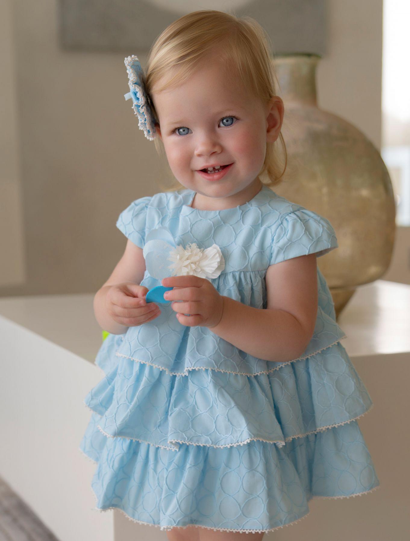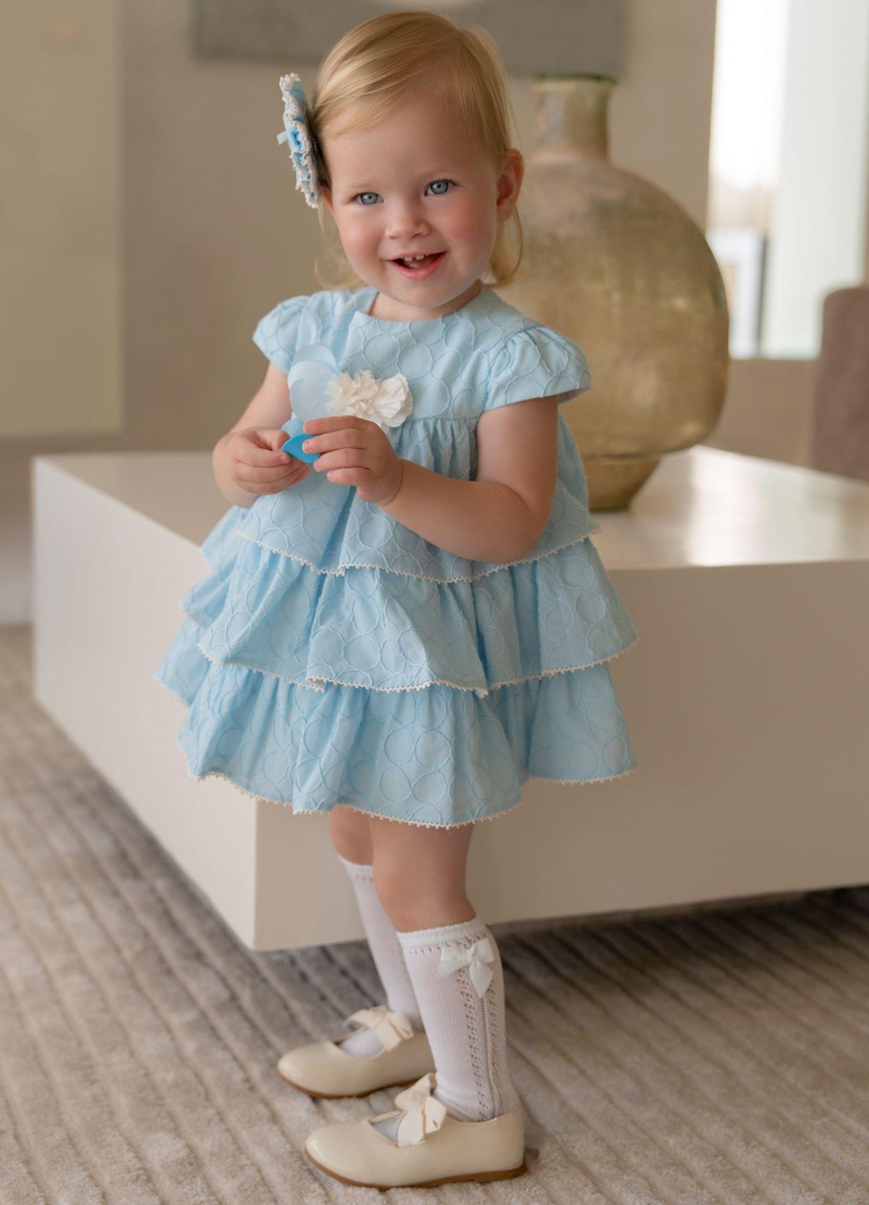 Espectacular vestido de manga corta para bebé niña de la marca Miranda, una prenda diseñada para destacar por su elegancia y dulzura. Confeccionado íntegramente en un tecido con relieve circular que aporta textura y sofisticación, se presenta en un encantador tono azul celeste, perfecto para los días especiales o celebraciones.