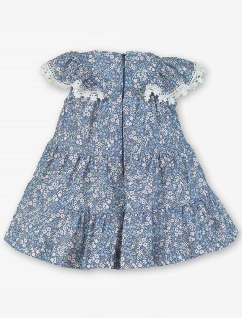 Atractivo vestido sin mangas para niña de la marca Miranda. Esta confeccionado en tejido de delicado estampado de flores en color azul y blanco. Es de corte evasé y lleva 2 cortes drapeados en la falda que le dan volumen. Luce cuello de grandes solapas rematado con puntilla blanca de flores y lazada de tela estampada. Cierra en la espalda.