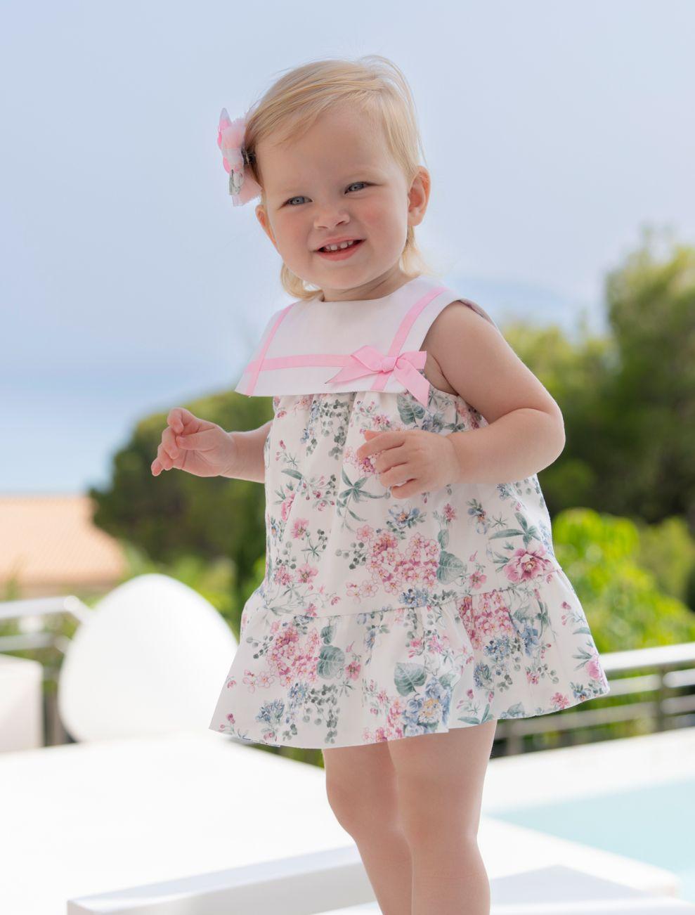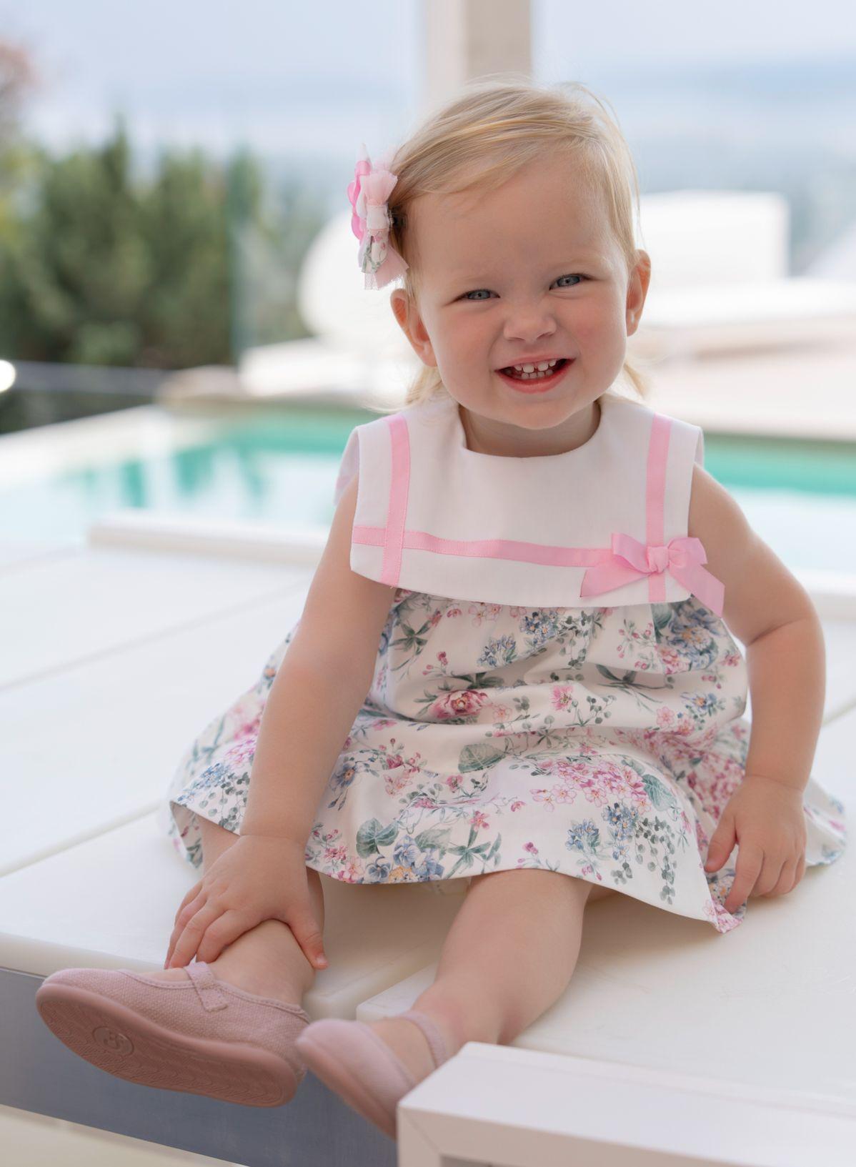 Fabuloso vestido sin mangas para niña de la marca Miranda, confeccionado en un tejido de delicado estampado de flores en tonos rosa y verde, que aporta frescura y dulzura al diseño.
