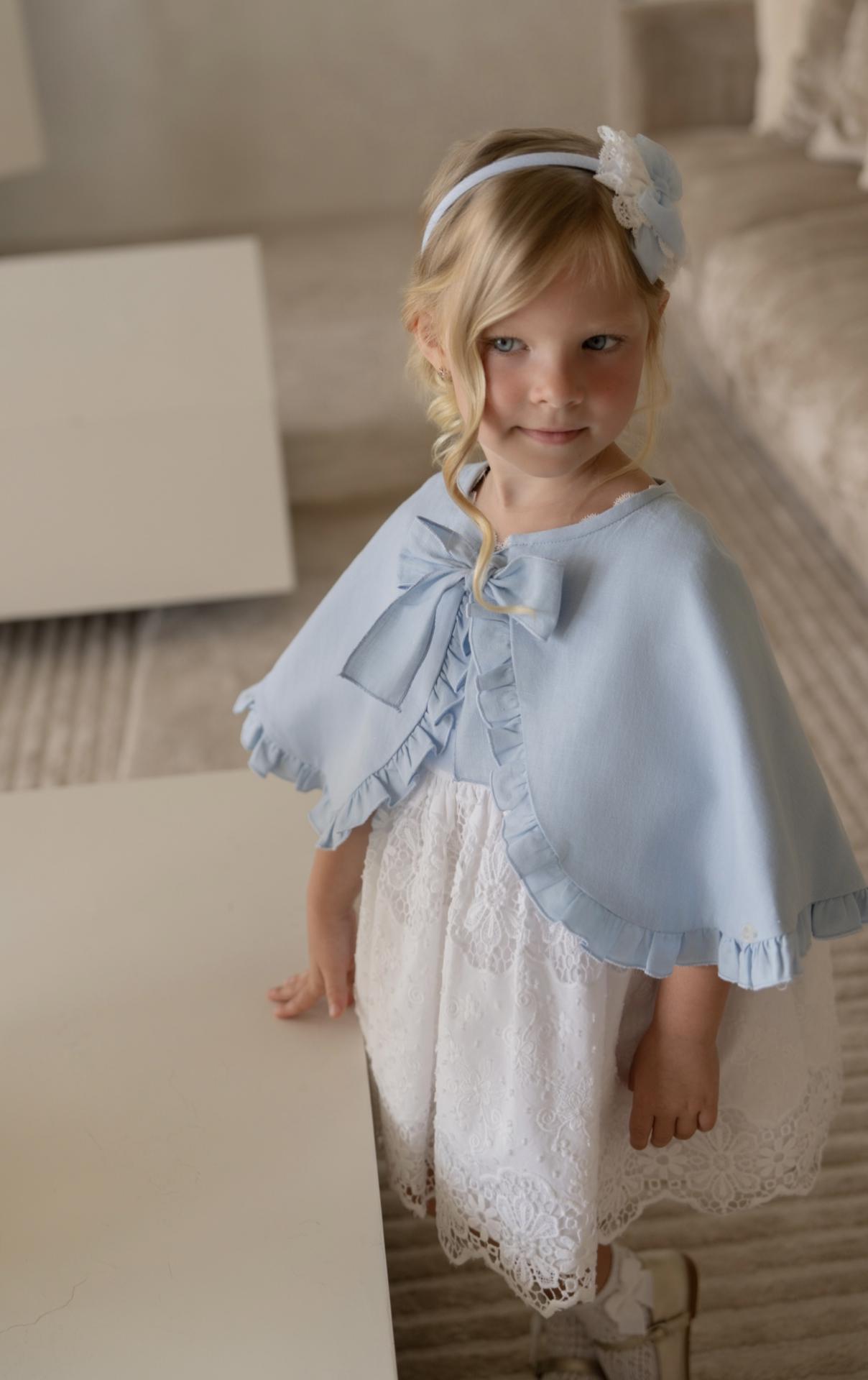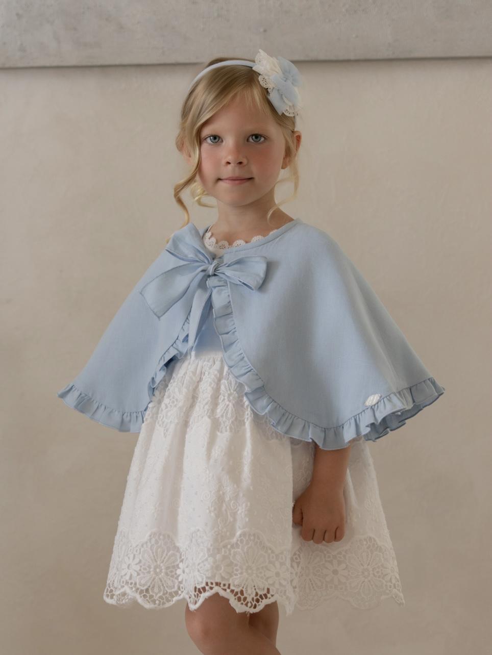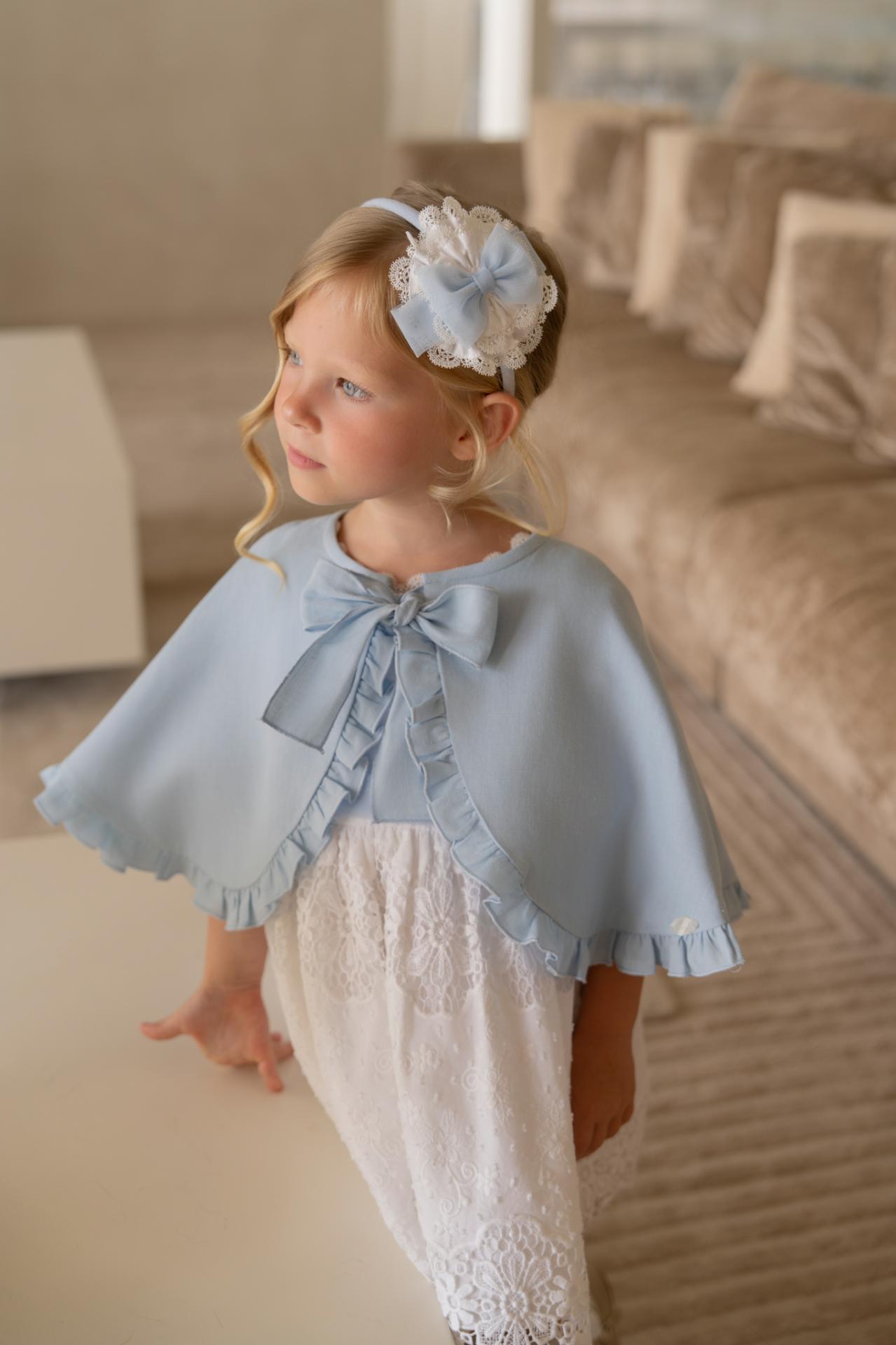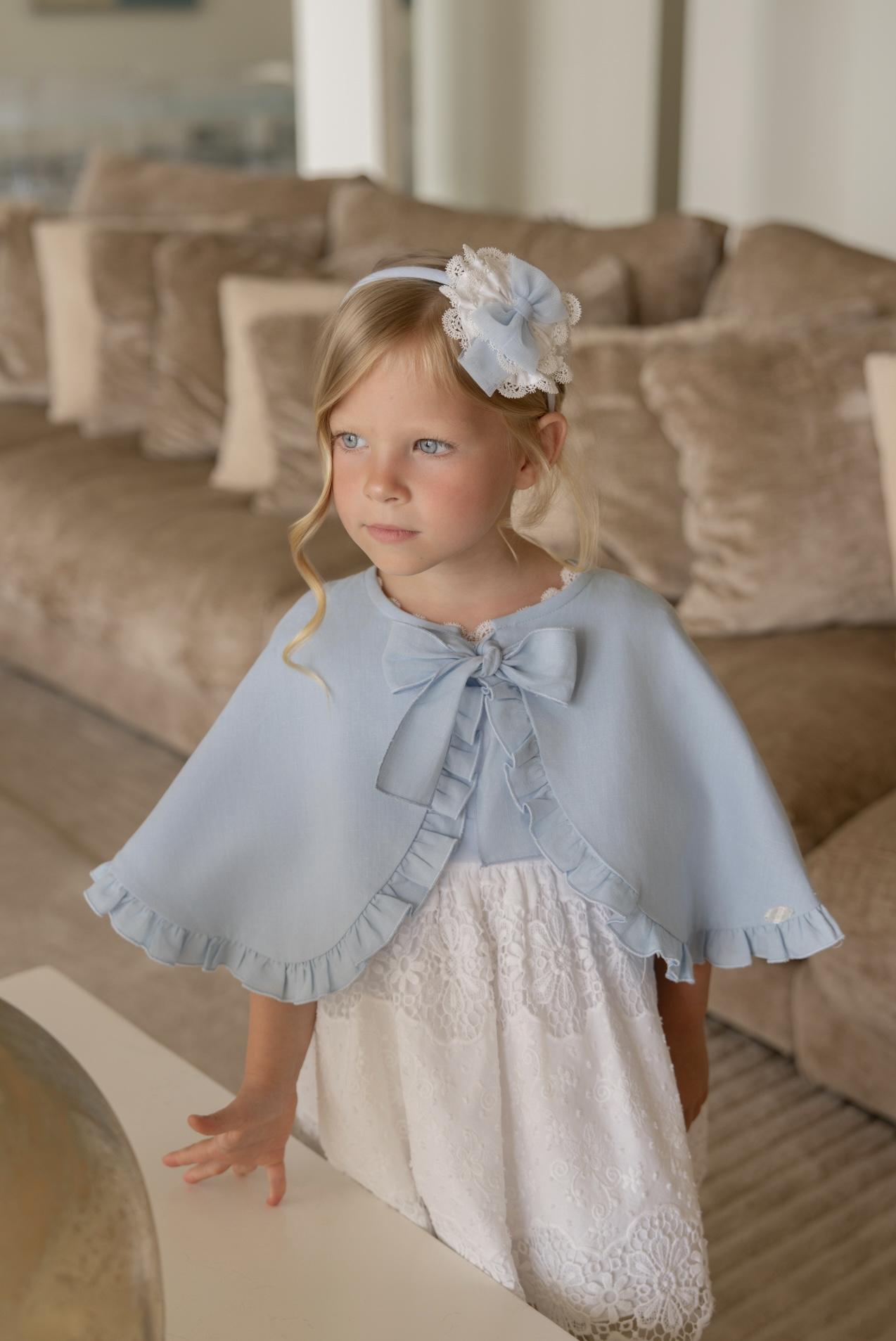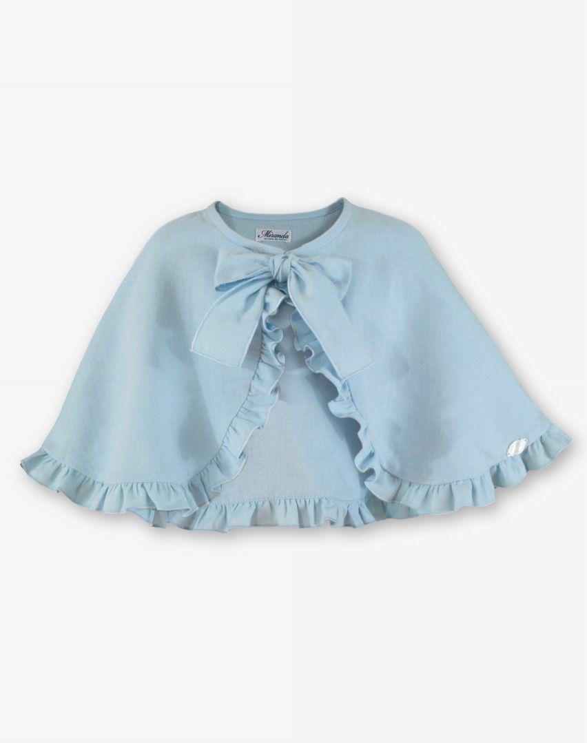 Encantadora capa para niña de la marca Miranda. Confeccionada en color azul celeste, luce volante de la misma tela alrededor de la prenda y gran lazada en el delantero. Combinable con los vestidos de la coleccion.