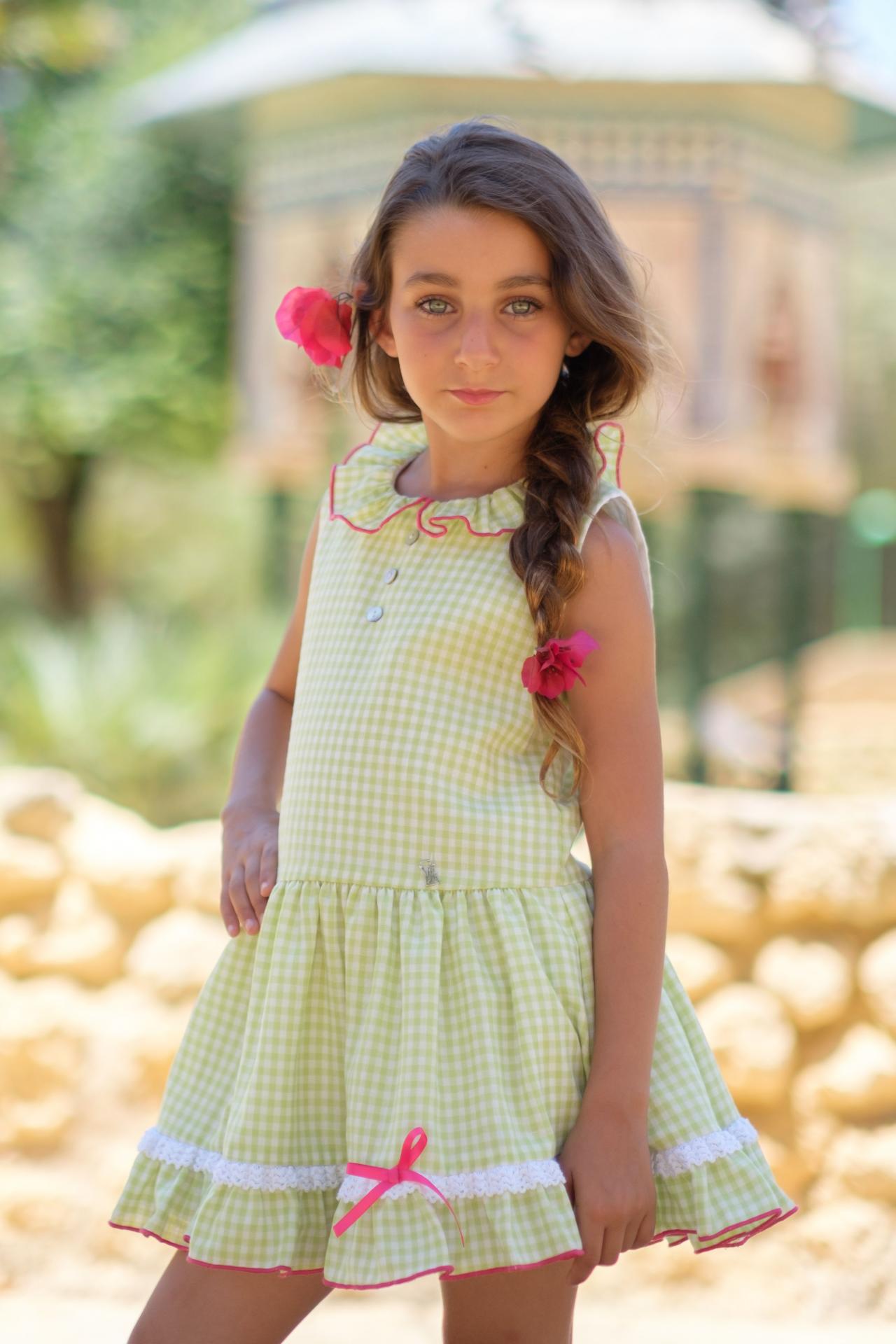 Nekenia Vestido Infantil Sapito Cuadros Vichy Pistacho Talle Bajo Volante Vivo Fucsia 24VV04