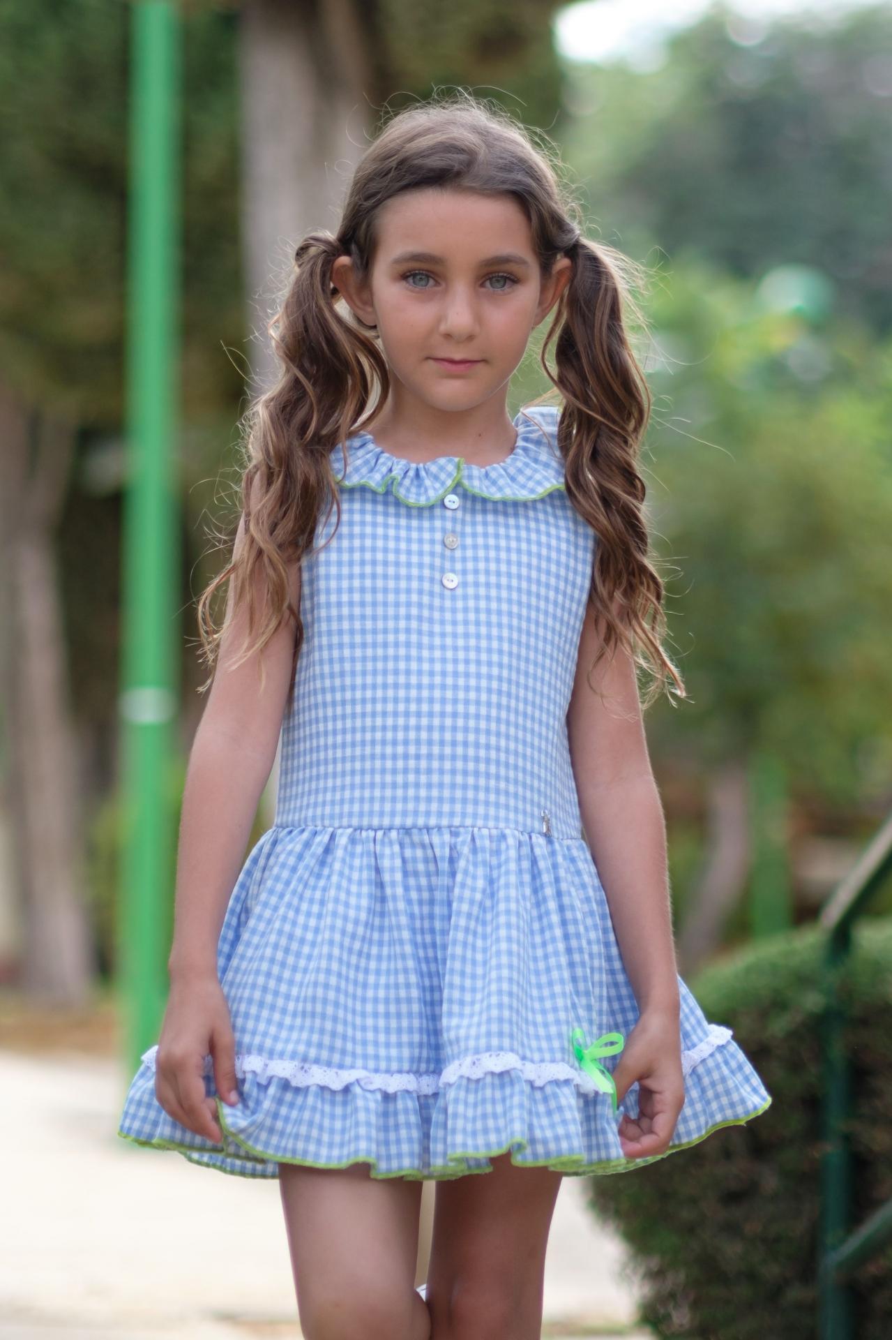 Nekenia Vestido Infantil Sapito Cuadros Vichy Azul Celeste Talle Bajo Volante Vivo Lima 24VV04