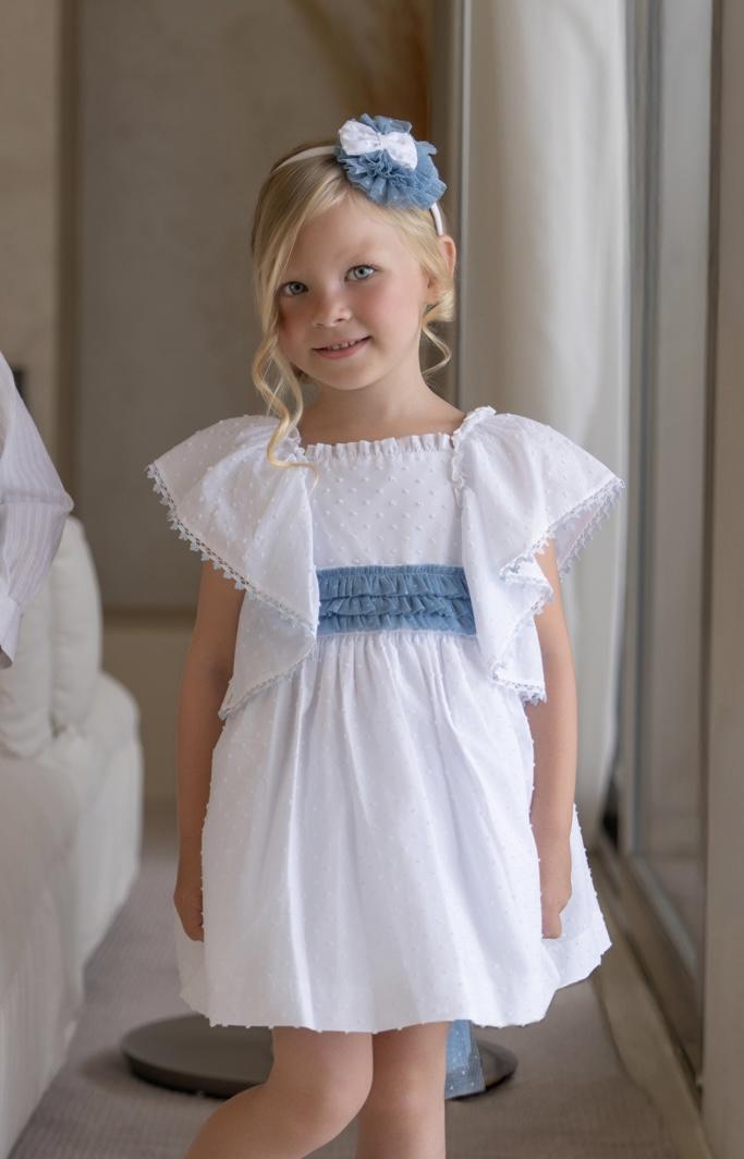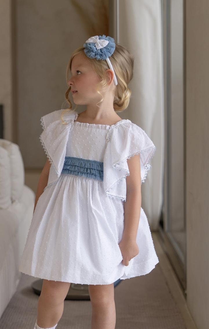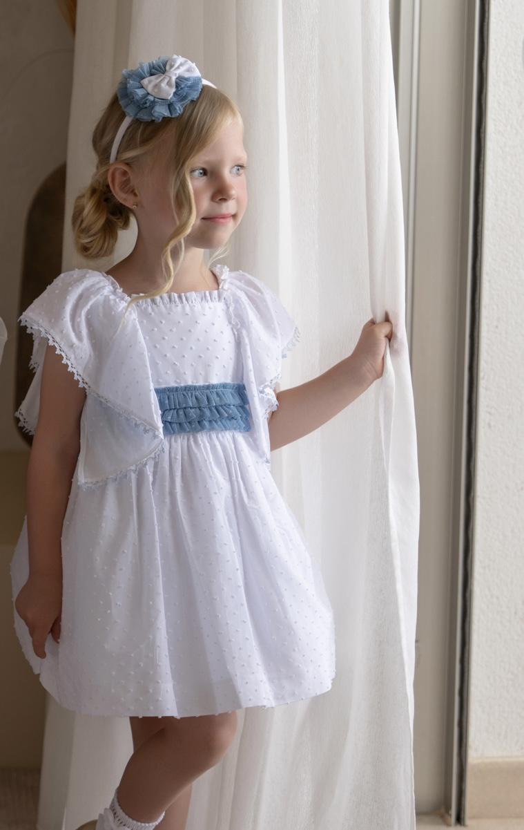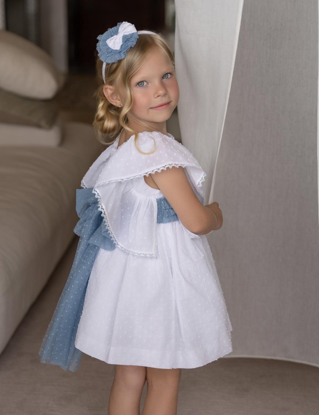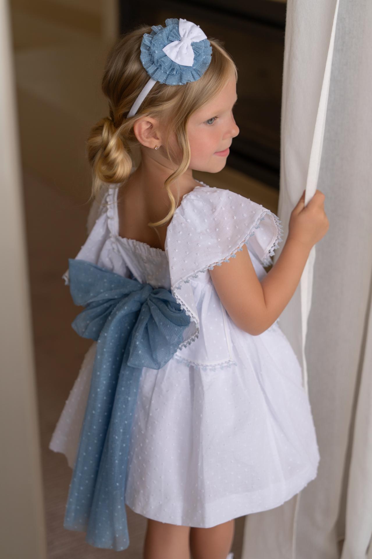 Miranda Vestido Infantil Ceremonia Plumeti Blanco lazada Azul "Geranio" 0228/V