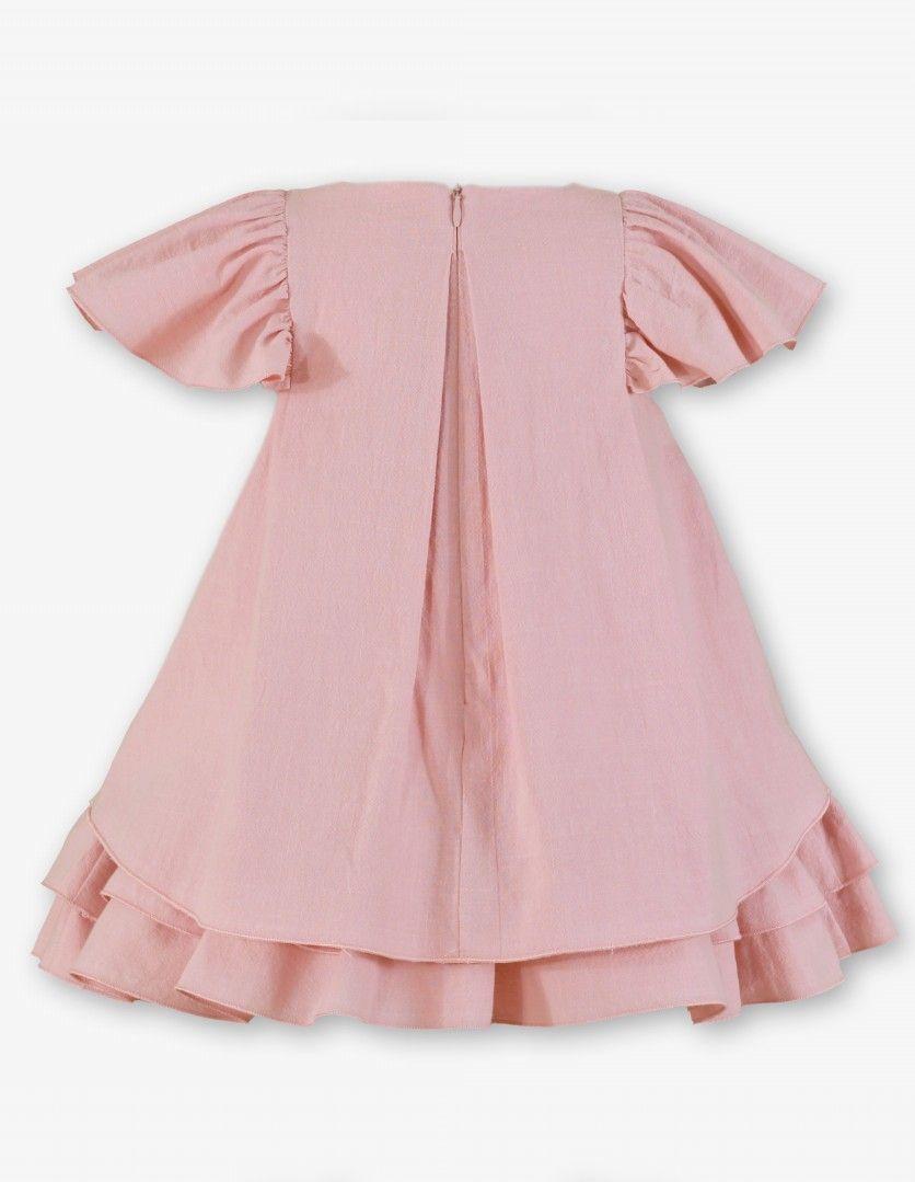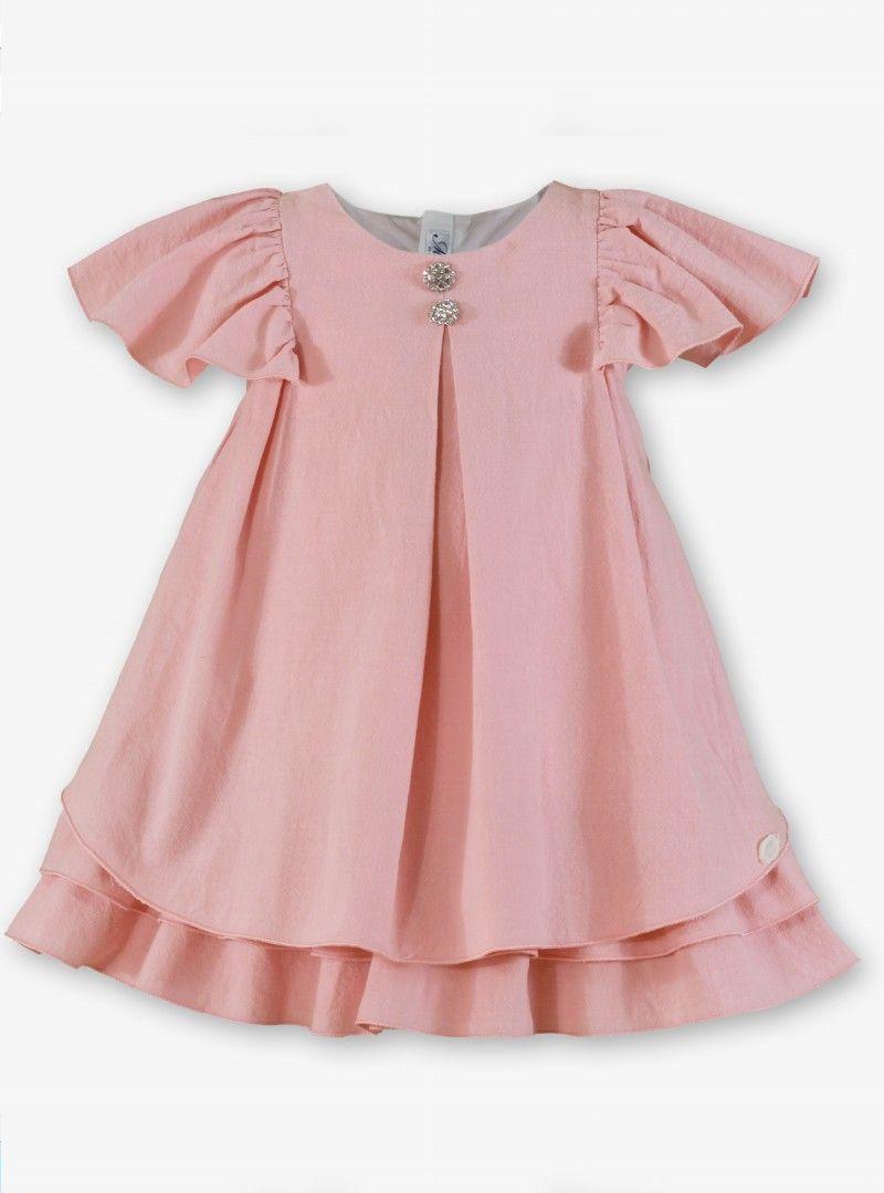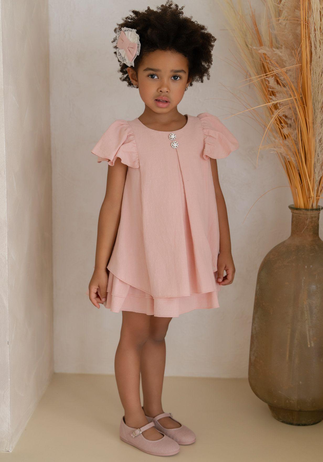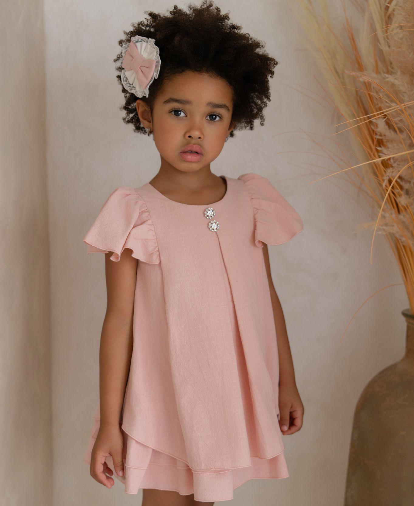 Ceremonial vestido de manga corta tipo farol para niña de la marca Miranda. Confeccionado integramente en color rosa palo. No lleva ningun tipo de corte, y luce un pliegue en el delantero con 2 botones tipo joya. La falda lleva 3 volantes colocados en el bajo a modo de capas. Cierra en la espalda.