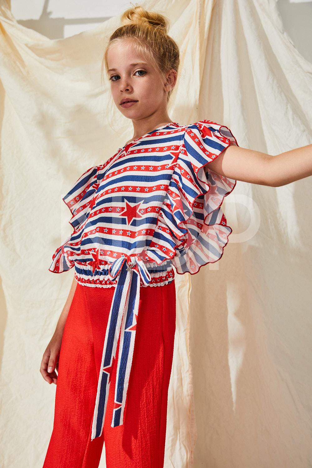 Nekenia Conjunto Infantil Top Rayas Volantes Pantalón Largo Rojo 23VC02