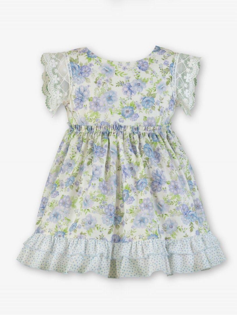 Encantador vestido para niña de la marca Miranda. Esta confeccionado en tejido estampado en tono azul celeste y lleva corte en la cintura con bastante drapeado. No lleva mangas, pero adorna los huecos con delicada puntilla, tambien presente en el generoso escote de la espalda. Luce 2 pequeños volantes de topos azul y blanco en el bajo de la prenda. Cierra en la espalda, donde presenta gran lazada de tela estampada de topos azul y blanco.