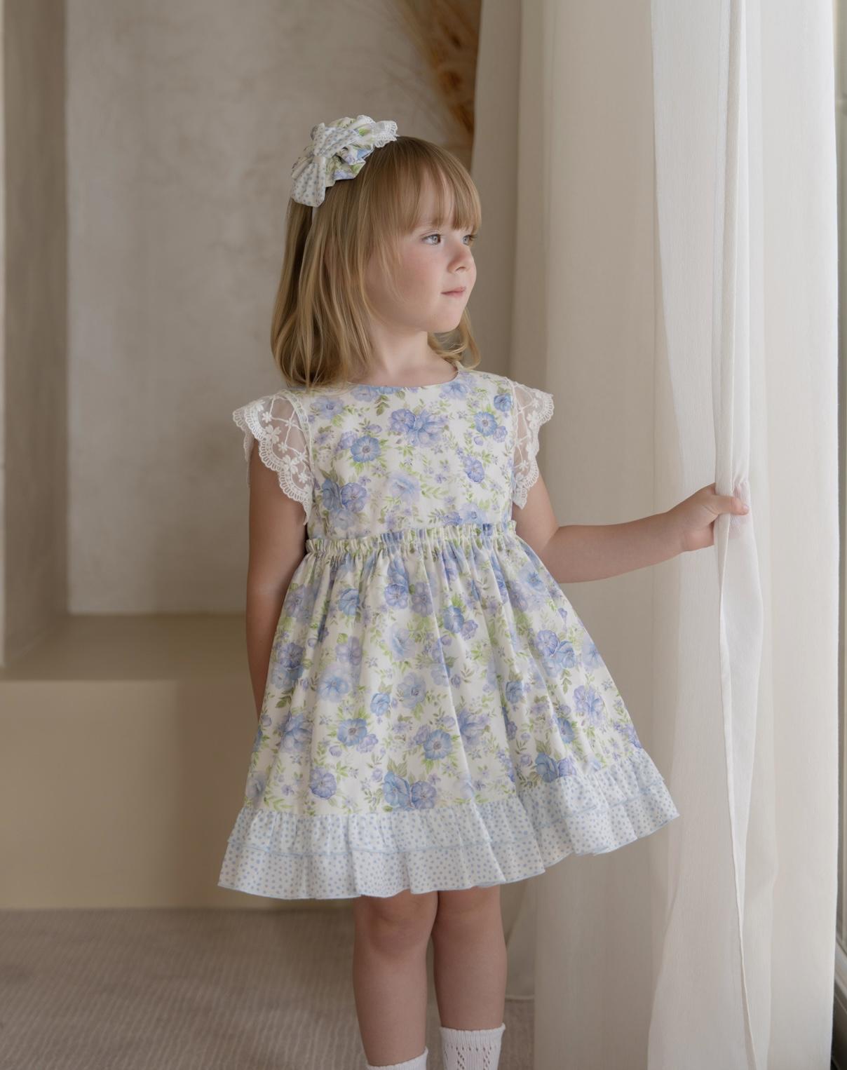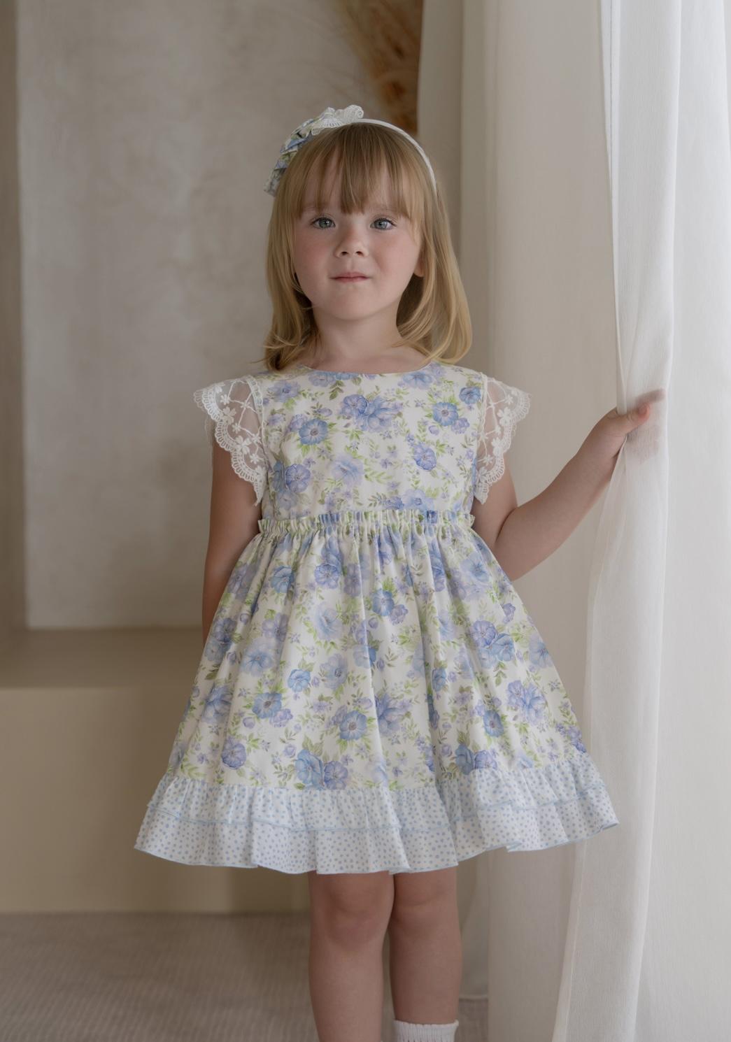 Encantador vestido para niña de la reconocida marca Miranda, una prenda diseñada con exquisito gusto y pensada para realzar la delicadeza y ternura de las más pequeñas. Este modelo está confeccionado en un precioso tejido estampado en tono azul celeste, un color suave y luminoso que aporta elegancia y frescura, ideal para los días más especiales.