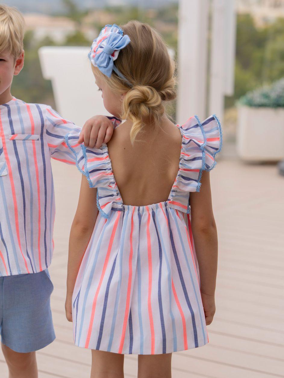 Grandioso vestido sin mangas para niña de la marca Miranda. Esta confeccionado en tejido blanco estampado de rayas de tonos azules y naranja fluor, dispuestas de manera hotizontal en el cuerpo y vertical en la falda. Lleva corte en la cintura con drapeado, donde ademas luce 2 lazadas de color azul. Lleva volante de la misma tela en el cuello y los hombros, que se desplaza hasta la espalda para enmarcar el pronunciado escote cuadrado. Ajusta en la espalda con elástico.