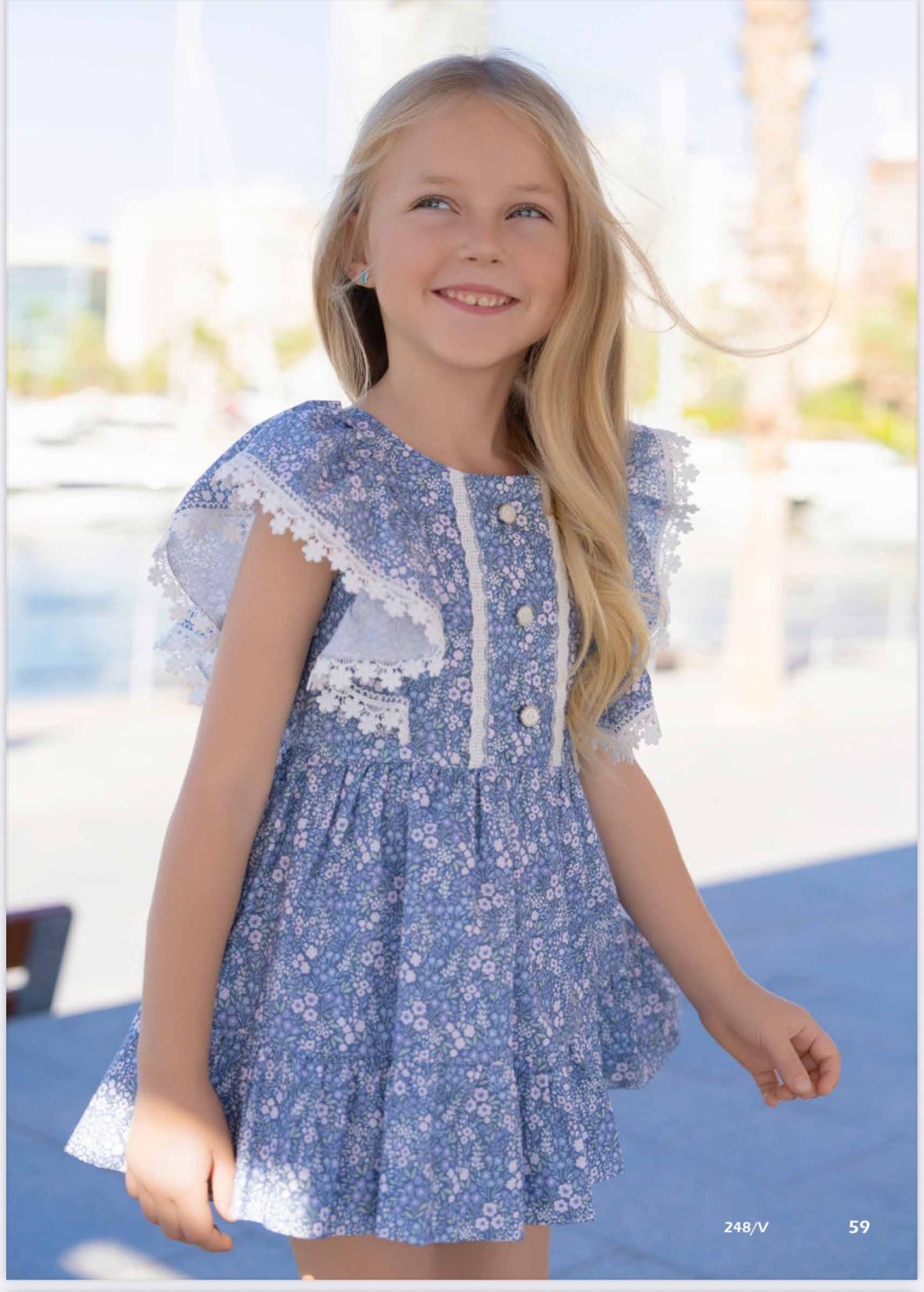 Atractivo vestido sin mangas para niña de la marca Miranda. Esta confeccionado en tejido de delicado estampado de flores en color azul y blanco. Es de corte en la cintura y drapeado en el corte. Luce volantes de la misma tela en los hombros rematado con puntilla blanca de flores y 3 botones blancos en el delantero.