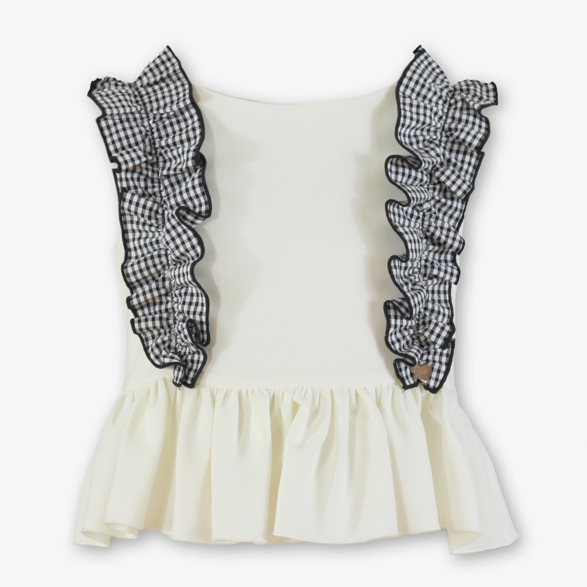 El conjunto está compuesto por un top de color beige, confeccionado en tejido suave y agradable al tacto. Luce volante en el bajo que aporta movimiento y delicadeza, así como volantes dobles de cuadro vichy blanco y negro en los hombros, un detalle coqueto que recorre ligeramente el delantero y la espalda, realzando el diseño y aportando un toque distintivo.