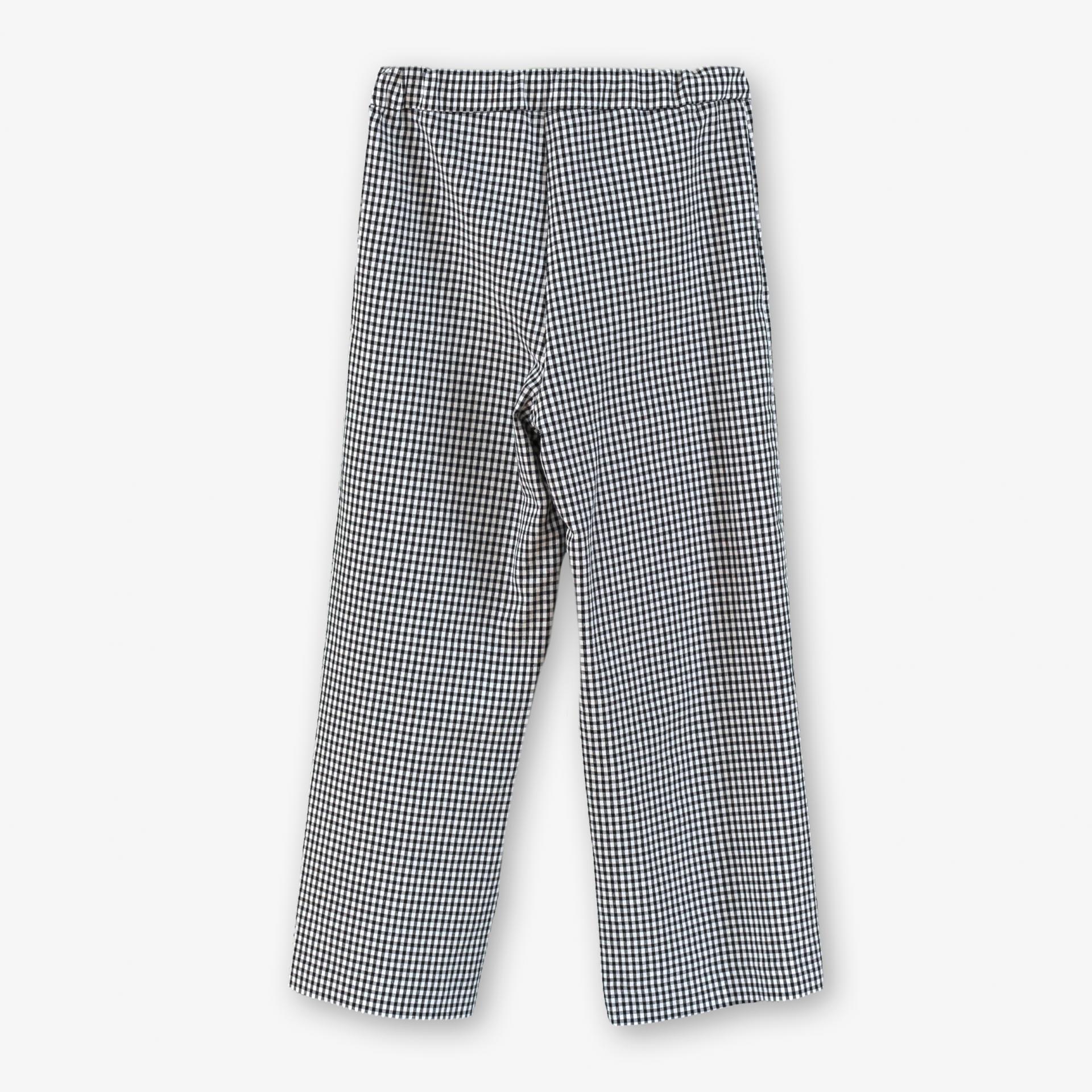 Se acompaña de un pantalón tobillero ancho, confeccionado en tejido estampado de cuadro vichy blanco y negro, que combina perfectamente con los detalles del top. El corte amplio y cómodo del pantalón permite libertad de movimiento, a la vez que mantiene un estilo elegante y actual.