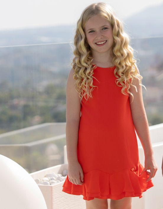 Estiloso vestido sin mangas para niña de la marca Miranda. Esta confeccionado en gasa de color naranja. es de corte evasé, lleva cuello redondo y luce 2 volantes de la misma tela en el bajo de la prenda. Cierra en la espalda con boton visto en el cuello, donde lleva pequeño escote lagrima y lazada.