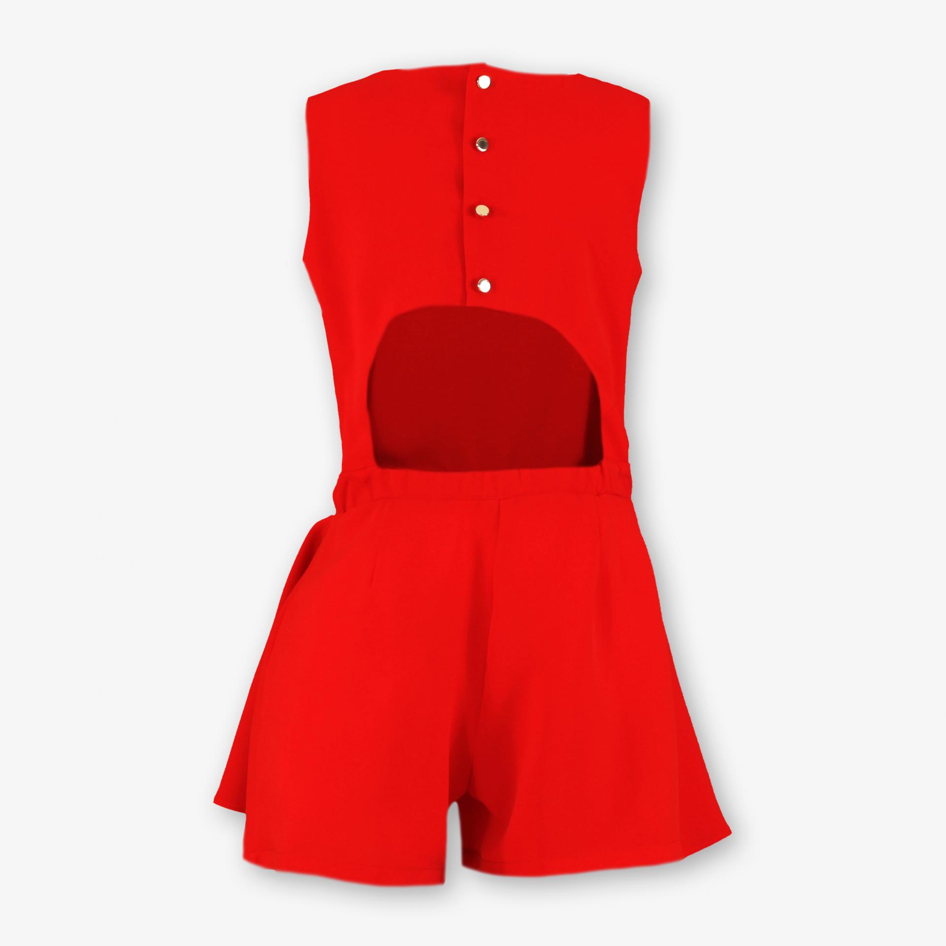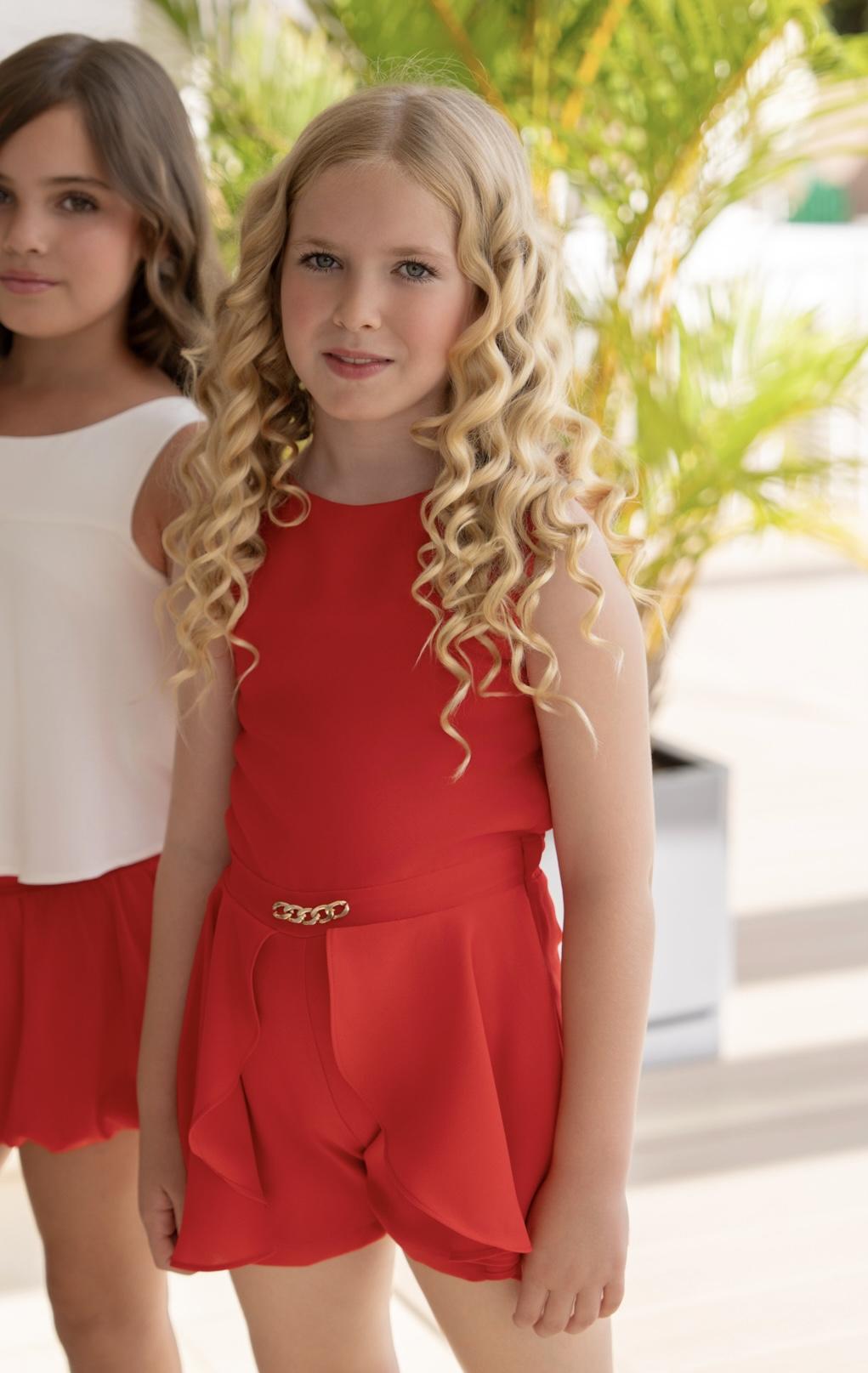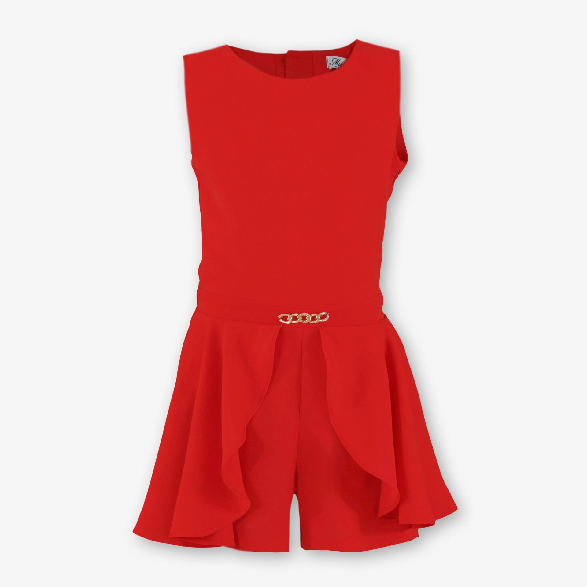 Original conjunto de una pieza para niña sin mangas de la marca Miranda. Esta confeccionado en color rojo y lleva corte en la cintura, donde luce cadena dorada de 5 eslabones. El pantalon esta cubierto por sobrefalda de la misma tela dispuesto dejando libre la parte delantera. Cierra en la espalda.