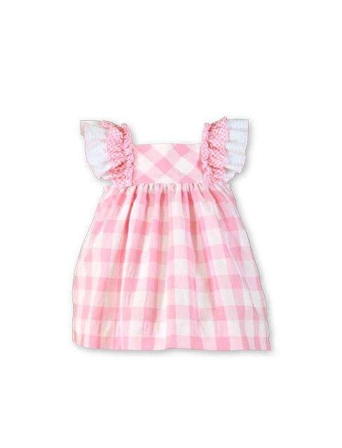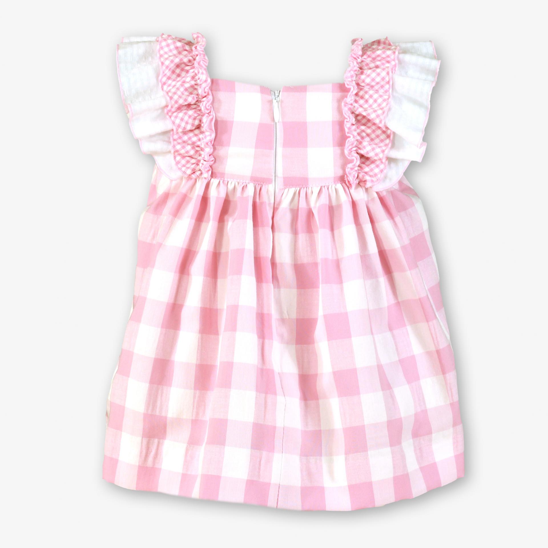 Singular vestido para bebe niña de la marca Miranda. Es de corte alto con mucho drapeado en el corte, que hace la falda voluminosa. Esta confeccionado en tejido estampado de cuadro vichy gigante rosa y blanco, y luce volantes en los hombros de cuadro vichy rosa y blanco y otro volante blanco. Tiene escote redondo y cierra en la espalda.
