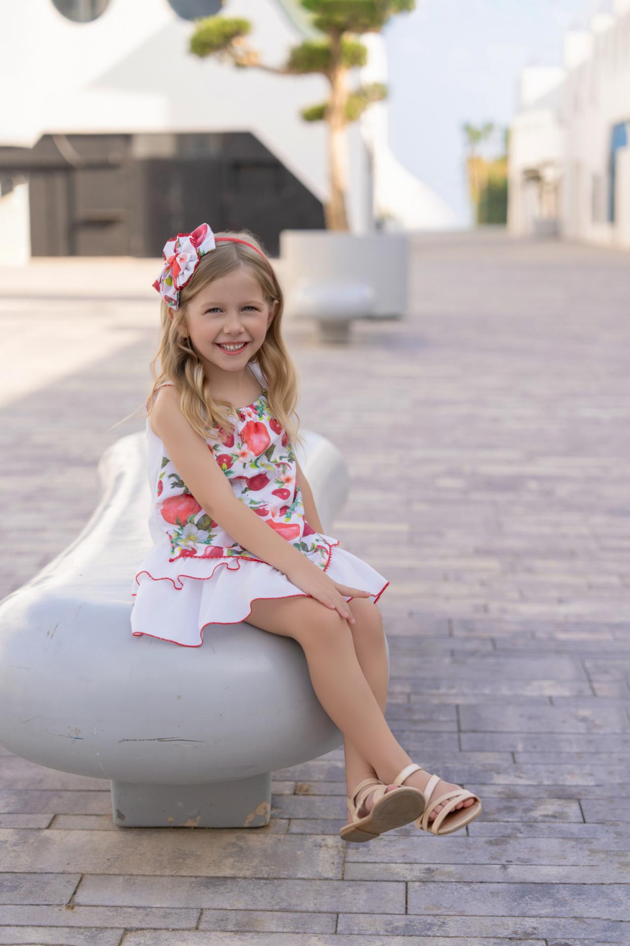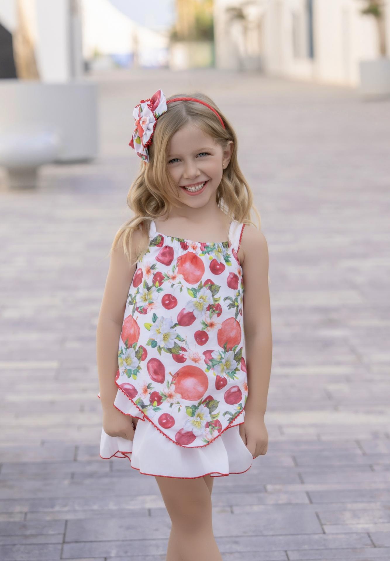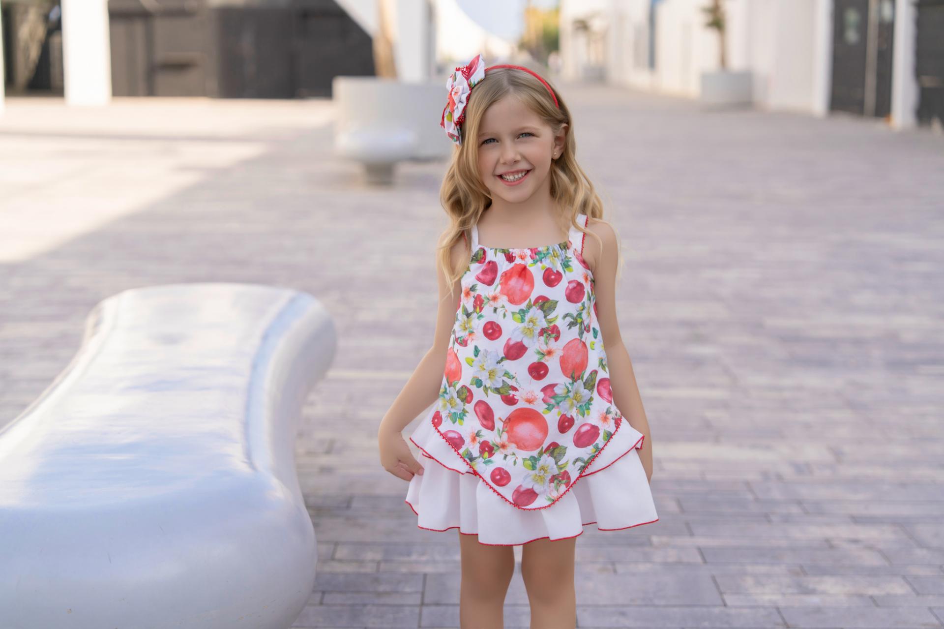 Original vestido de tirantes para niña de la marca Miranda, ideal para los días de verano por su diseño fresco y lleno de encanto. Está confeccionado en color blanco, con el cuerpo delicadamente estampado de flores y frutas en alegres tonos rojos que aportan un aire dulce y veraniego. La falda está compuesta por dos volantes blancos que añaden volumen y movimiento, rematados con un fino ribete de hilo rojo que realza el diseño y combina a la perfección con el estampado del cuerpo.