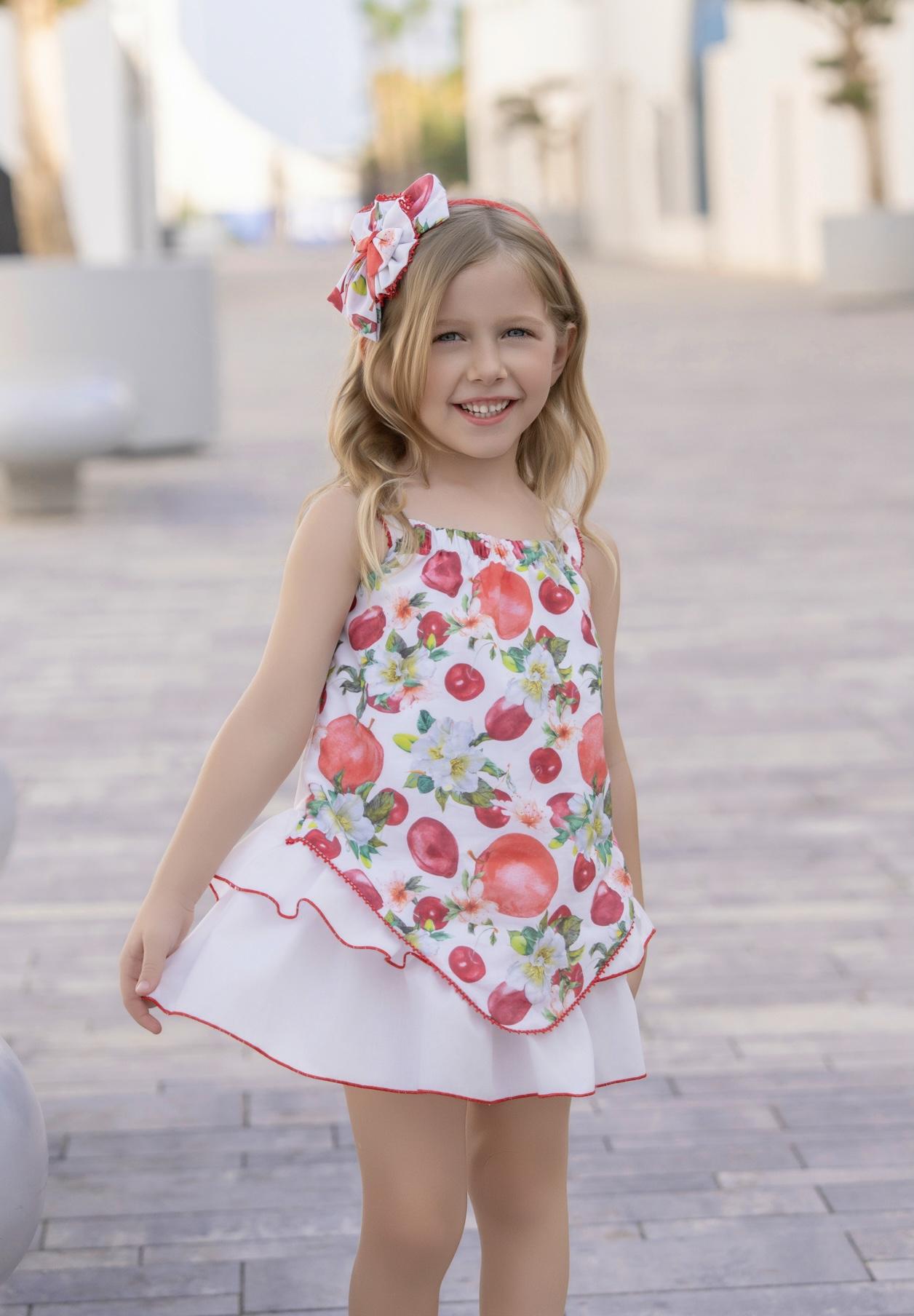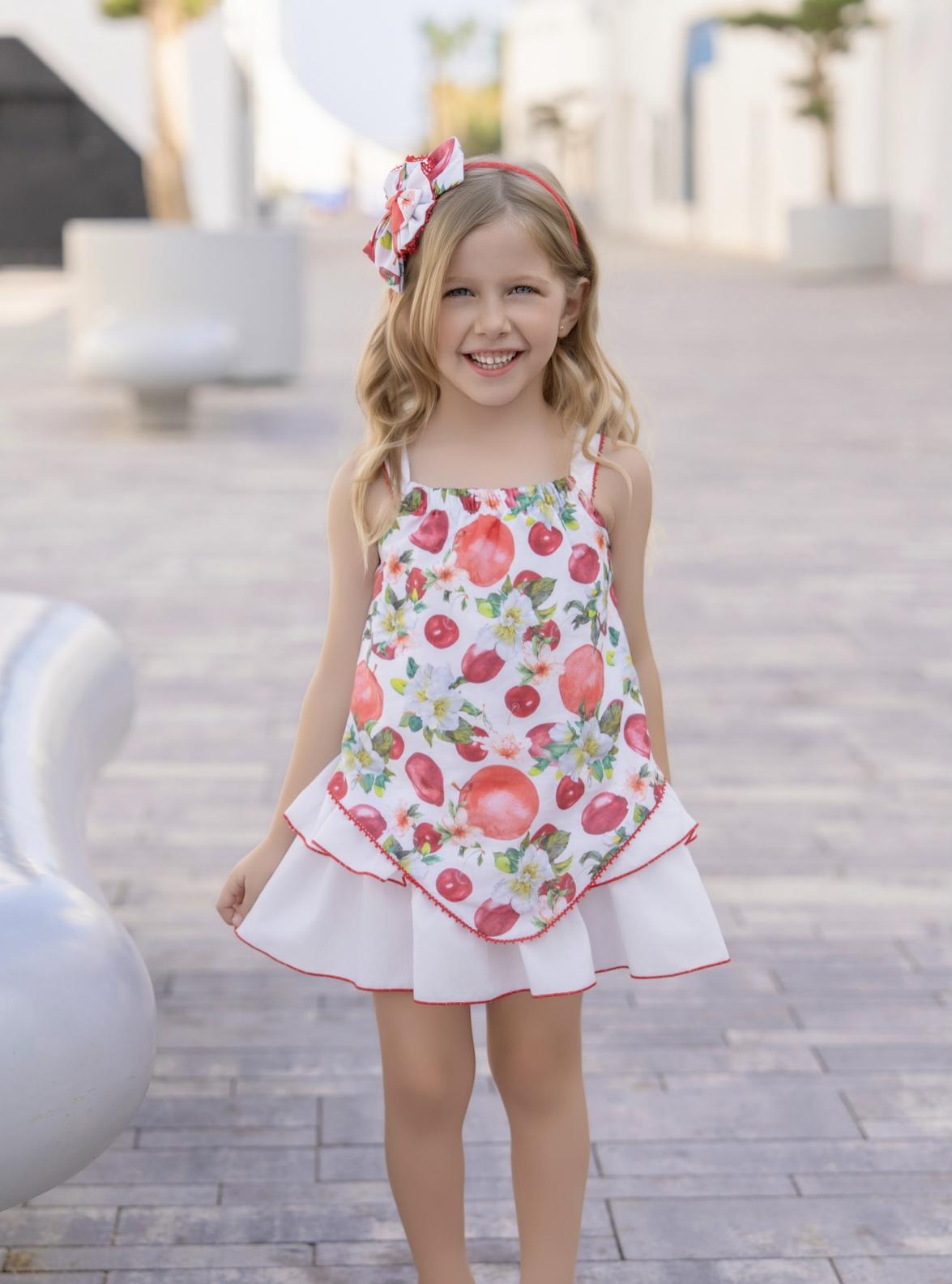 Original vestido de tirantes para niña de la marca Miranda. Es de color blanco con el cuerpo estampado de flores y frutas en tono rojo y la falda de 2 volantes blancos ribeteados con hilo rojo. Tienes escote cuadrado y el cuerpo del vestido termina en pico por delante. Cierra en la espalda.