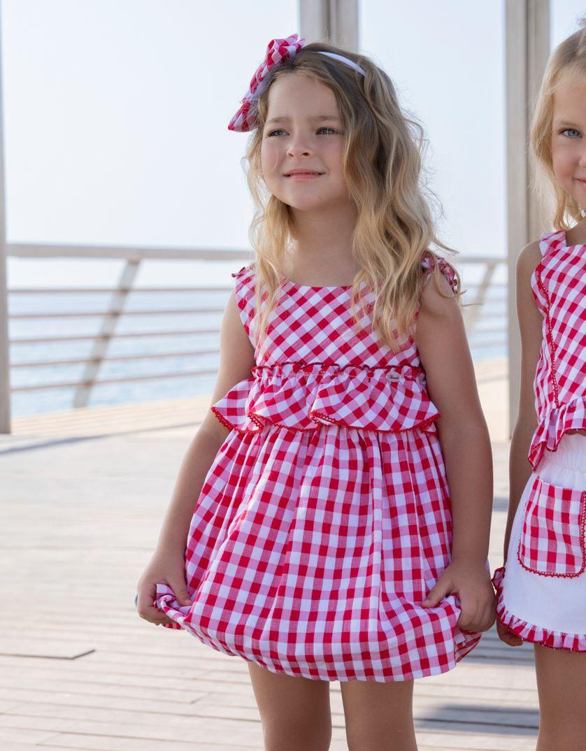 Vistoso vestido sin mangas para niña de la marca Miranda. Esta confeccionado en tejido de cuadros rojo y blanco, y luce volante de la misma tela en el delantero tapando el corte. Lleva gran escote en la espalda, donde los tirantes se dividen y van cubiertos por volante de la misma tela. Cierra en la espalda con botonadura vista de 2 botones rojos.