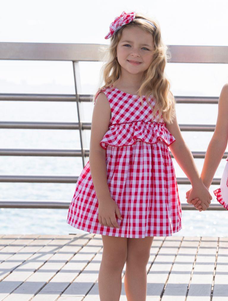 Vistoso vestido sin mangas para niña de la marca Miranda, diseñado para destacar por su estilo alegre y veraniego. Está confeccionado en un llamativo tejido de cuadros rojo y blanco, una combinación clásica que aporta frescura y encanto.