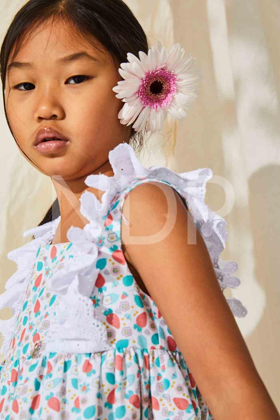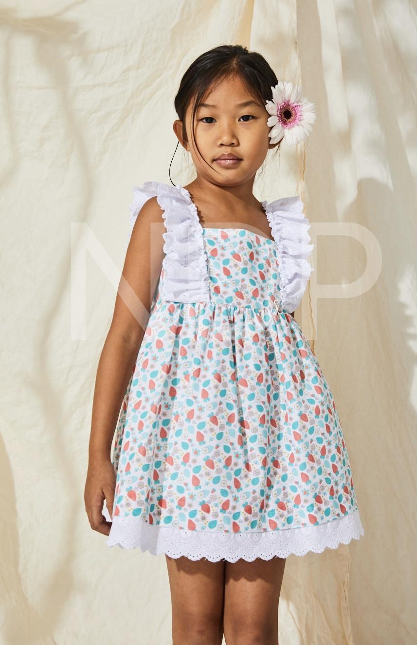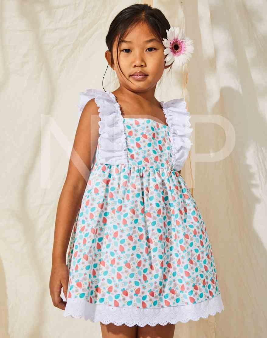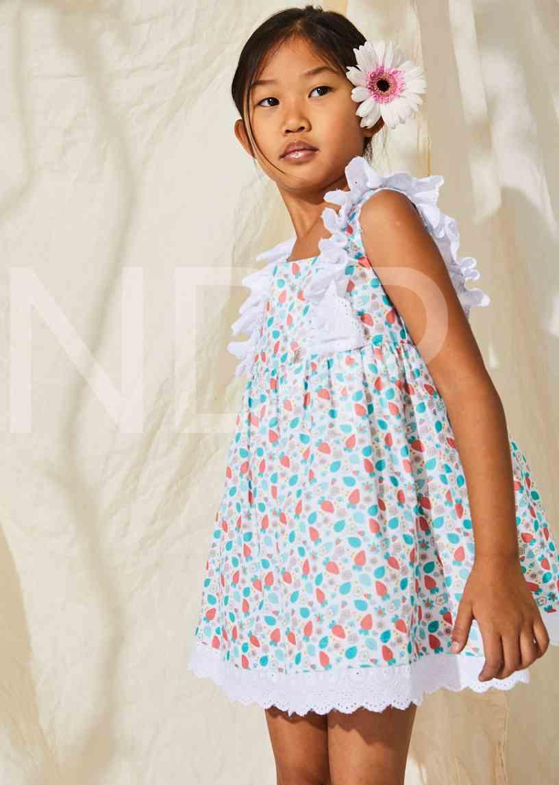 Nekenia Vestido Infantil Vuelo Estampado Floral Fresas Volantes Tira Bordada Blanco 23VV30