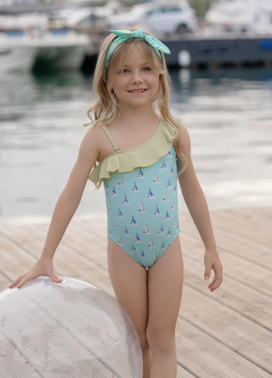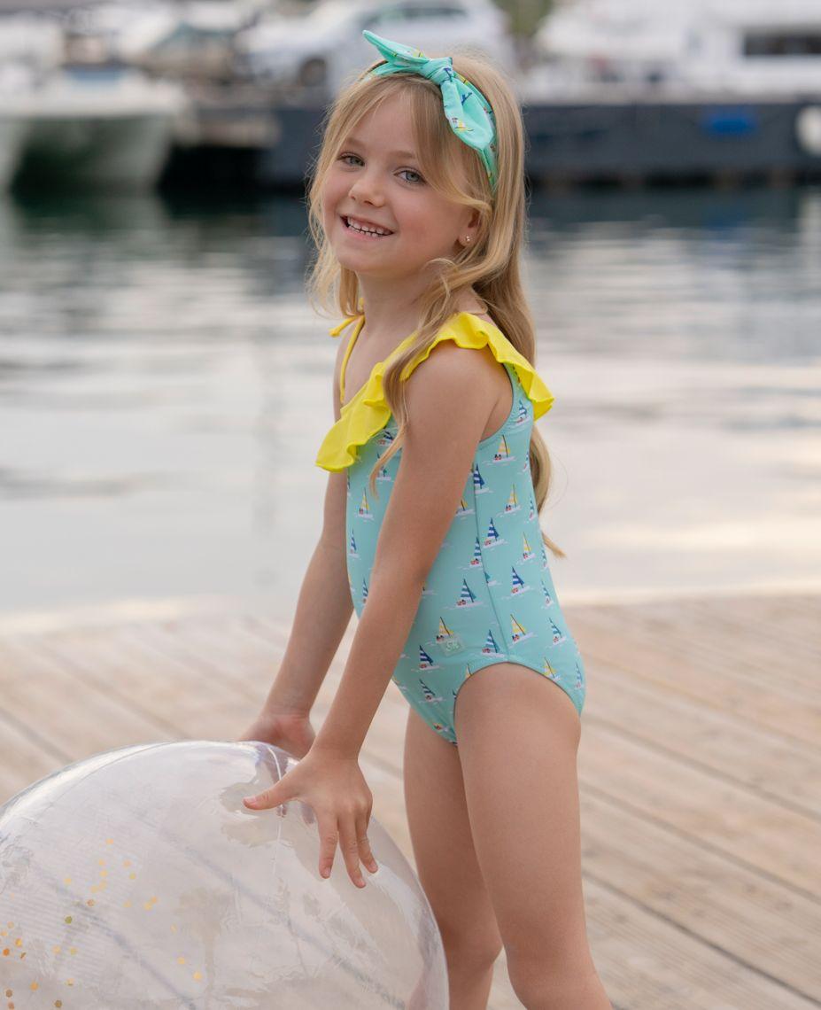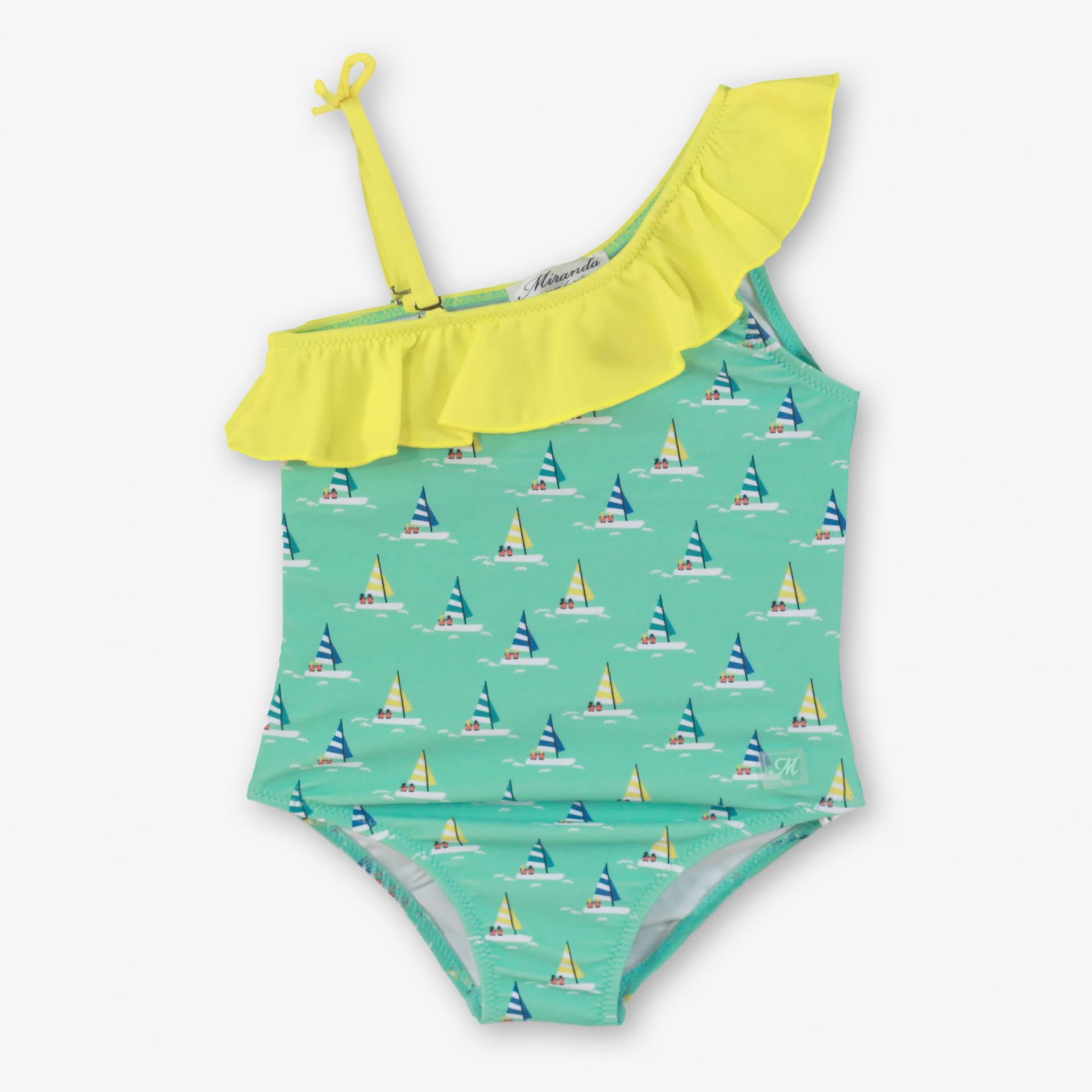 Elegante prenda de baño para niña de la marca Miranda. El bañador esta confeccionado en color azul estampado de veleros. Luce tirantes asimetricos con volante amarillo en el escote.