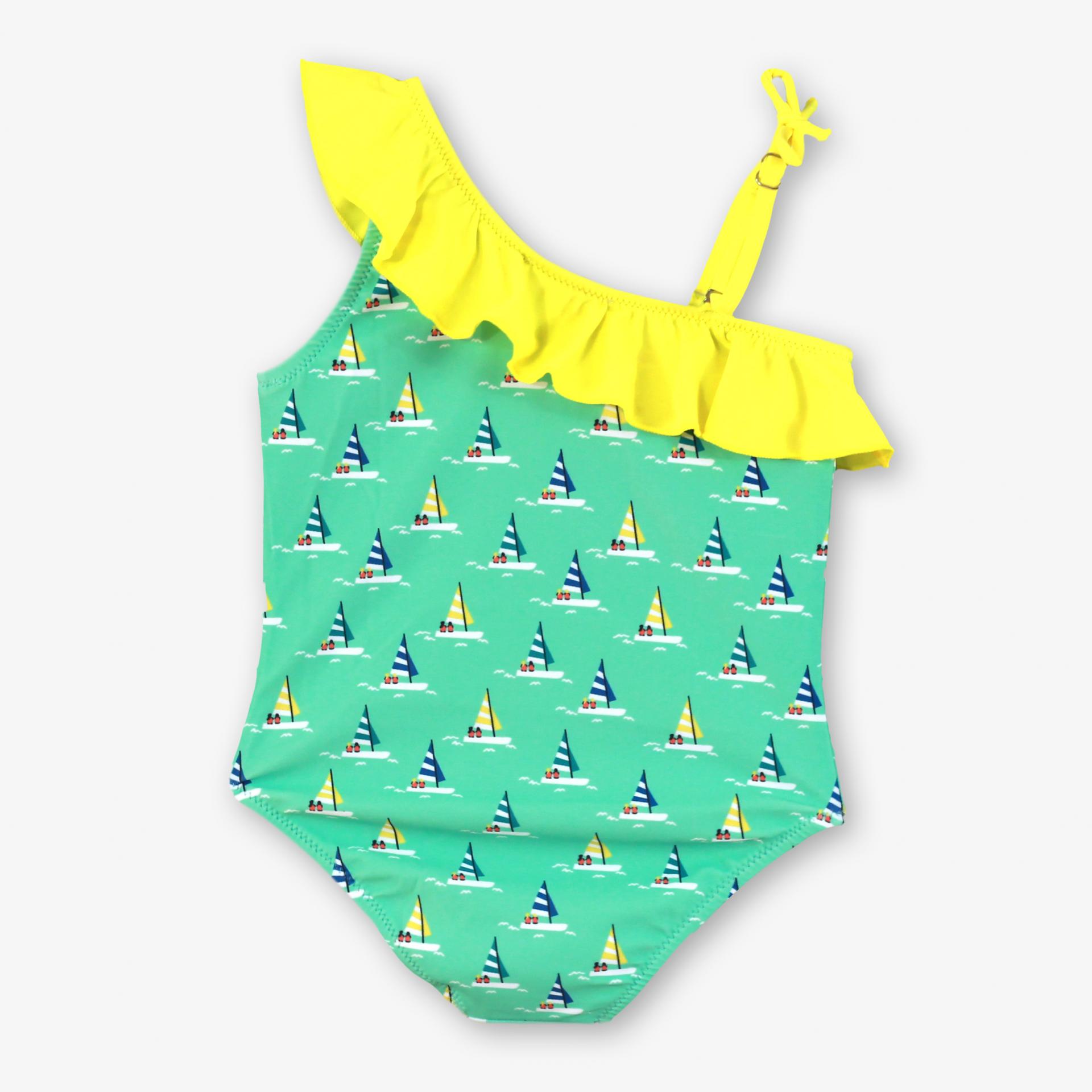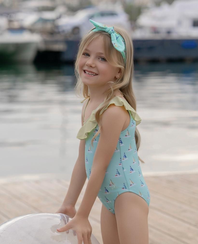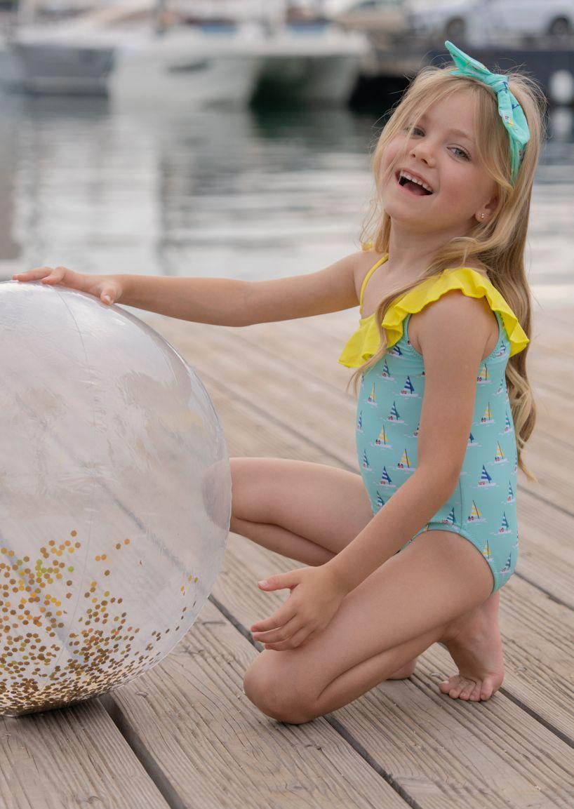 Elegante prenda de baño para niña de la marca Miranda. El bañador esta confeccionado en color azul estampado de veleros. Luce tirantes asimetricos con volante amarillo en el escote.