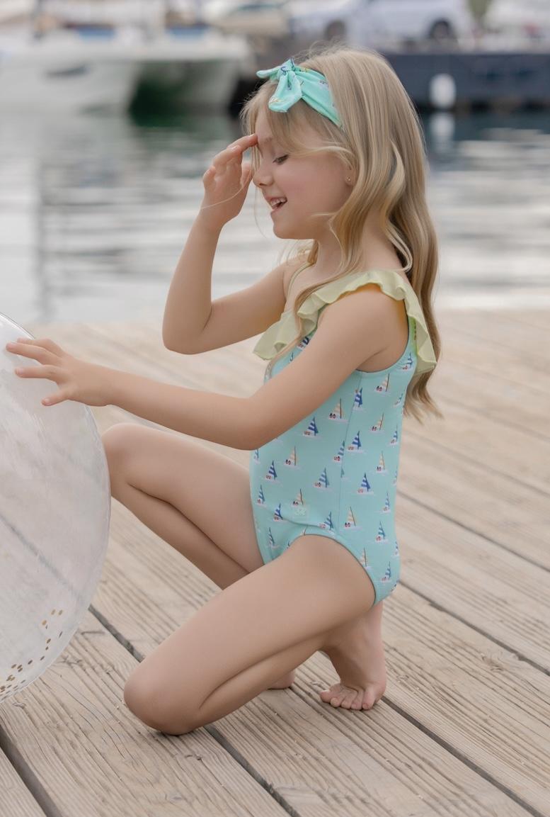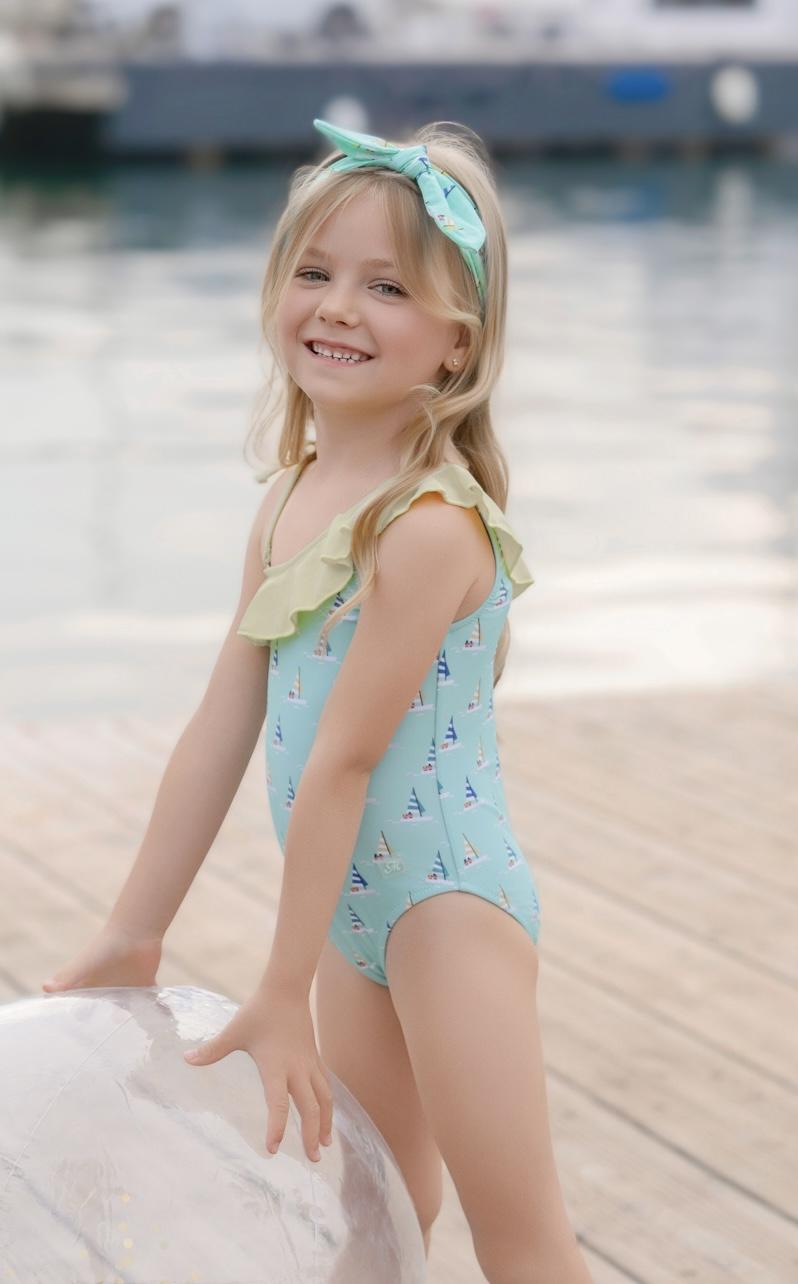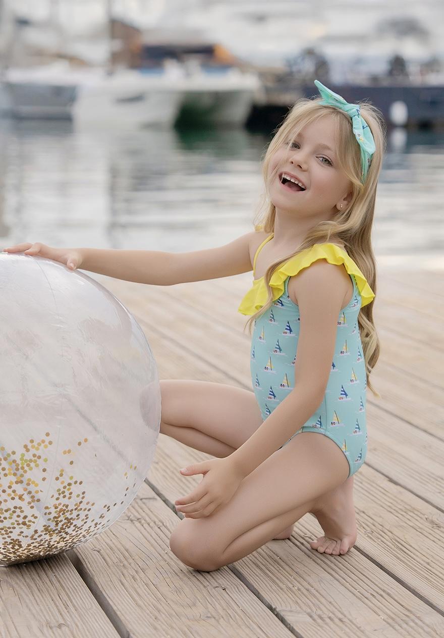 Elegante prenda de baño para niña de la marca Miranda, perfecta para disfrutar del verano con estilo. El bañador está confeccionado en color azul y luce un delicado estampado de veleros, que aporta un aire marinero y fresco.