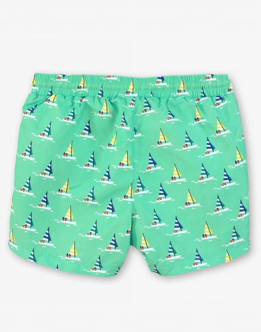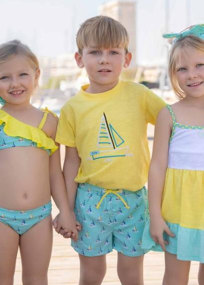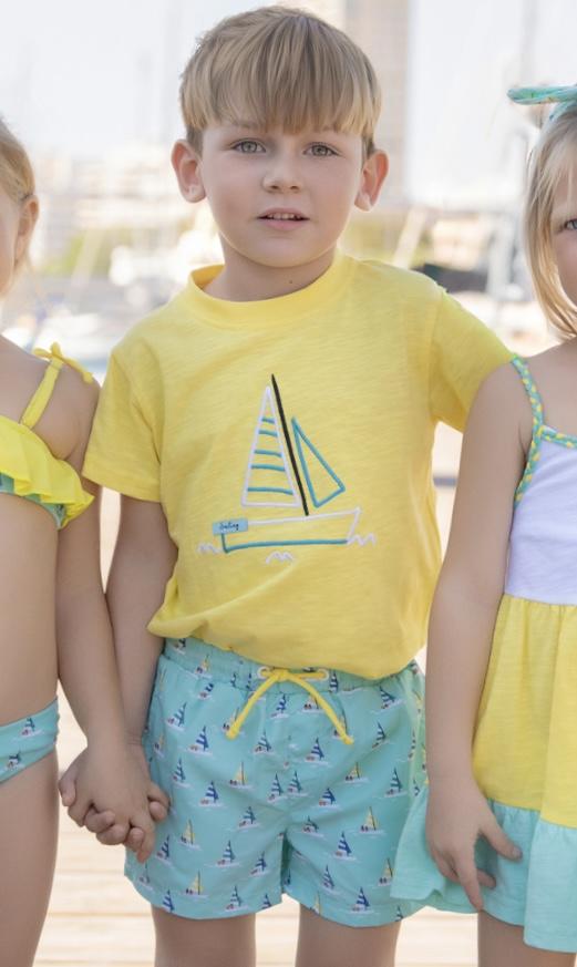 Vistoso bañador para niño de la marca Miranda. Es de pantalon corto confeccionado es color azul estampado de veleros. Ajusta en la cintura con elástico y cordón amarillo.