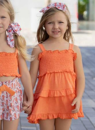 Fabuloso vestido de tirantes para niña de la marca Miranda. Es de estilo sencillo y esta confeccionado en color naranja. Lleva corte en la cintura y el cuerpo es elástico. Luce escote cuadrado por delante y por detrás. La falda lleva volante en el bajo y en un corte central que lleva en la falda.