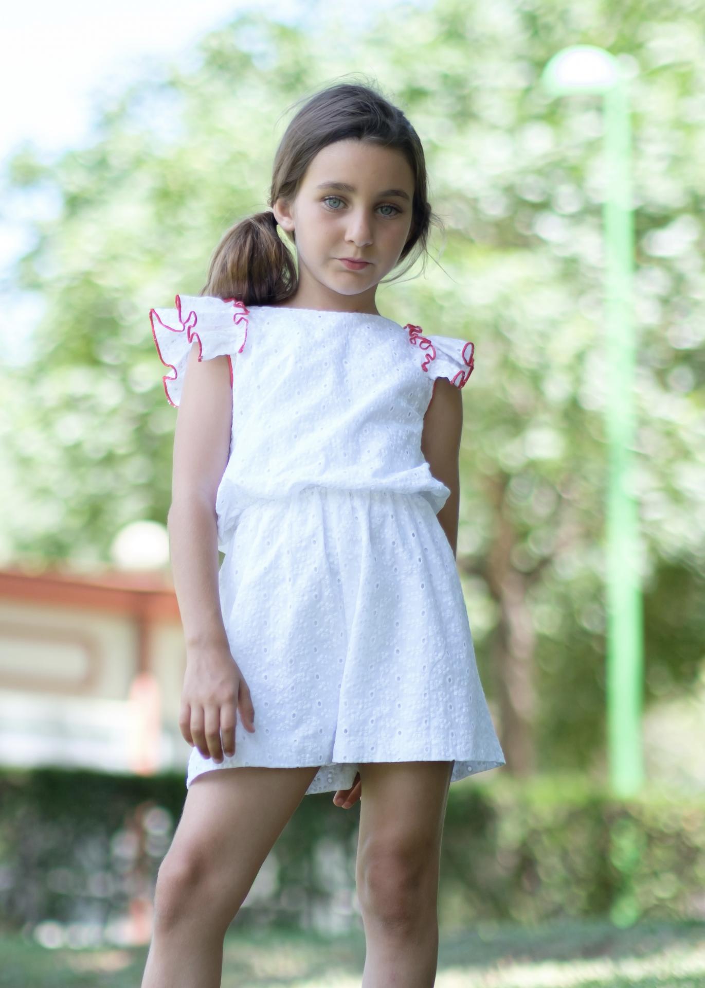 Nekenia Mono Infantil Bordado Algodón Blanco Vivo Rojo Escote Espalda 24VP04